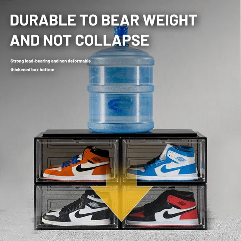 Hard shoe box clear transparent magnetic acrylic door shoebox side drop stackable shoe storage box organization