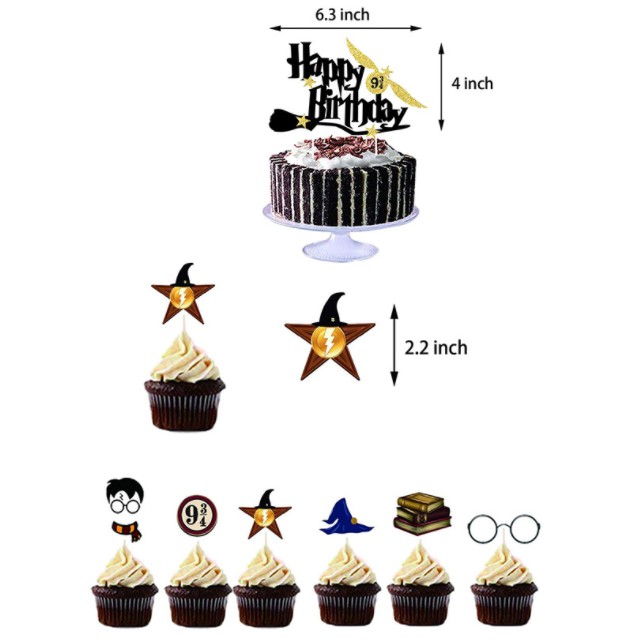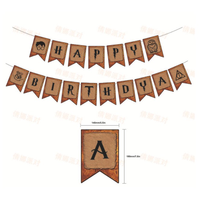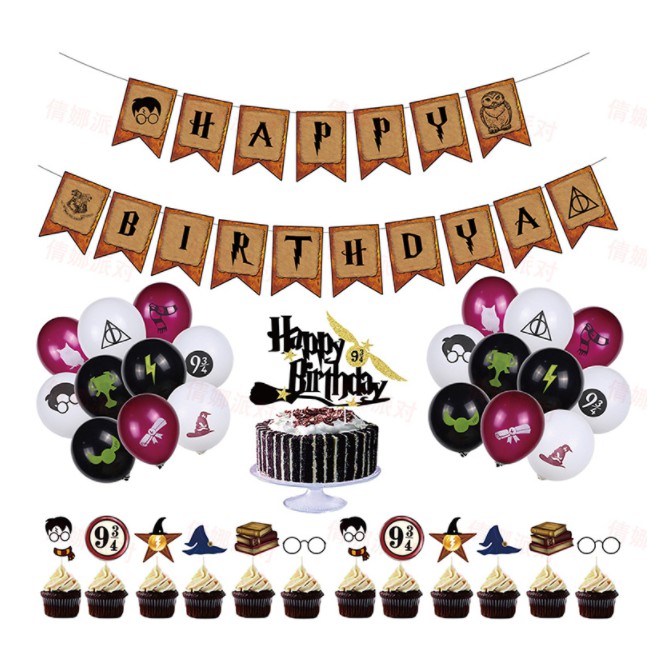 Harry Potter-themed party decorations, children's birthday cake with flags and balloons,