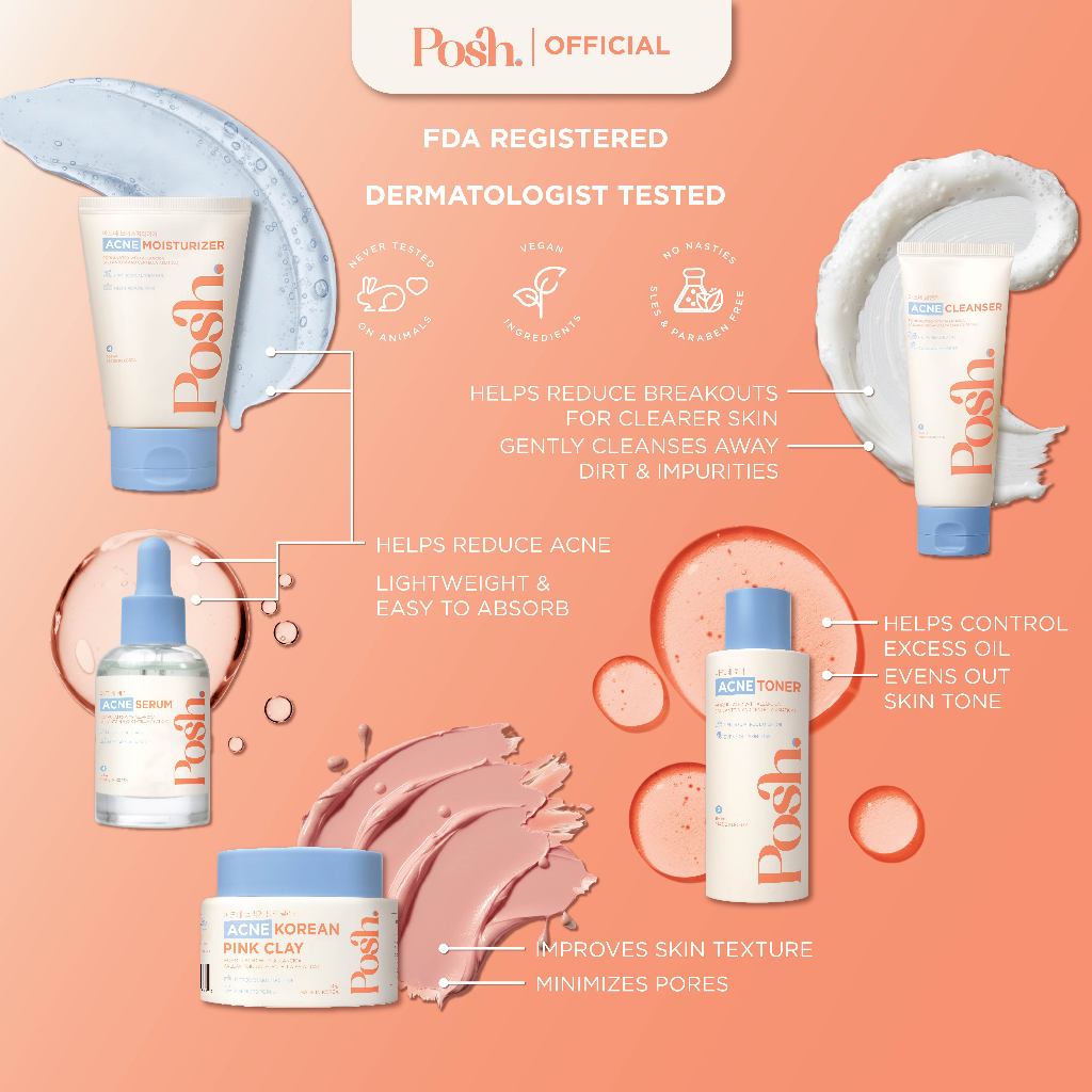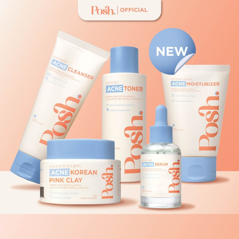 Posh Skincare Acne Set 5 - Cleanser 100ml, Clay Mask 50g,Toner 150ml, Serum 30ml, Moisturizer 100ml