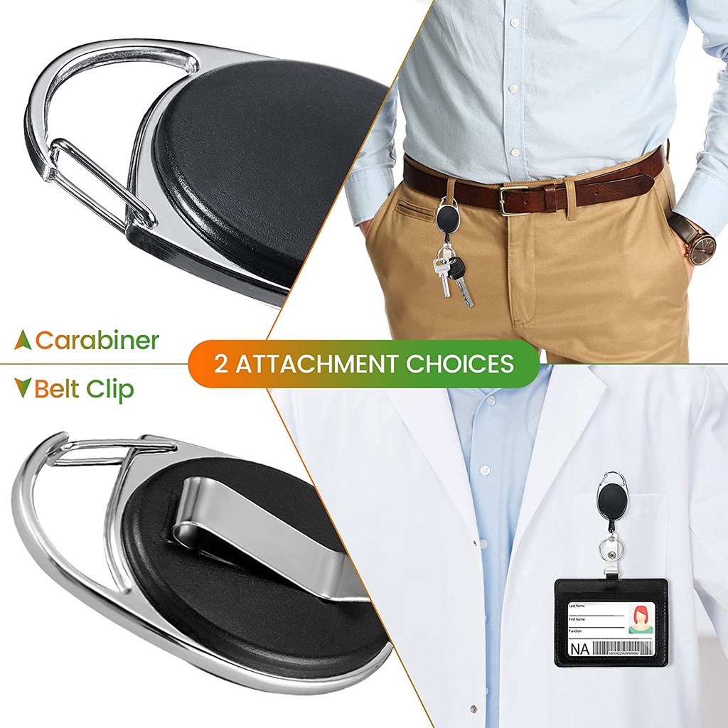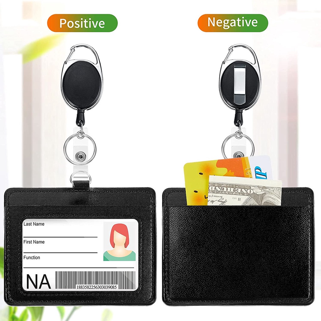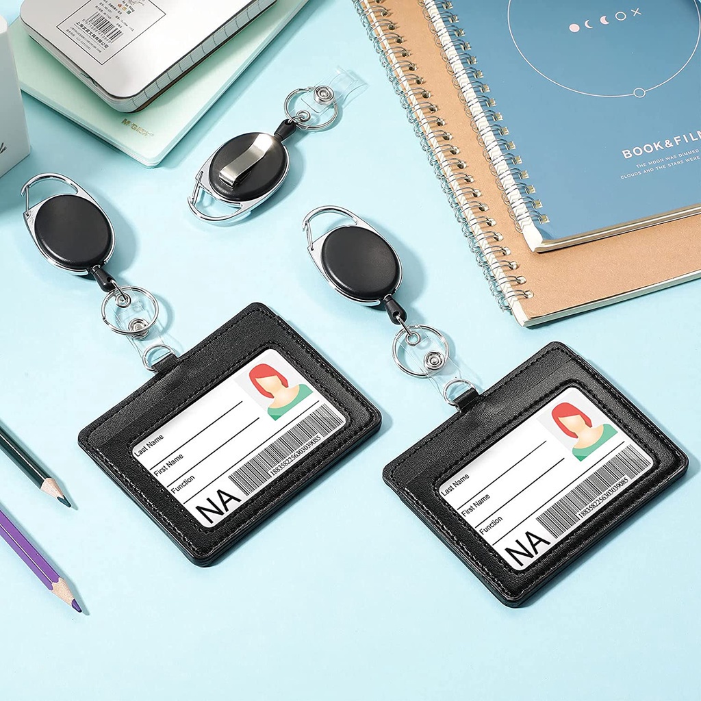 Heavy Duty ID Badge Reel Clips Horizontal PU Leather Badge Holders with 1 Clear ID Card Window and 2 Credit Card Slots,Heavy Duty Badge Holders and Retractable Reel Clips Set