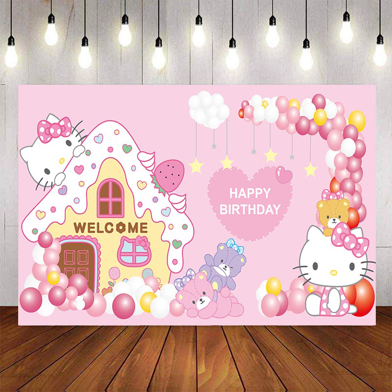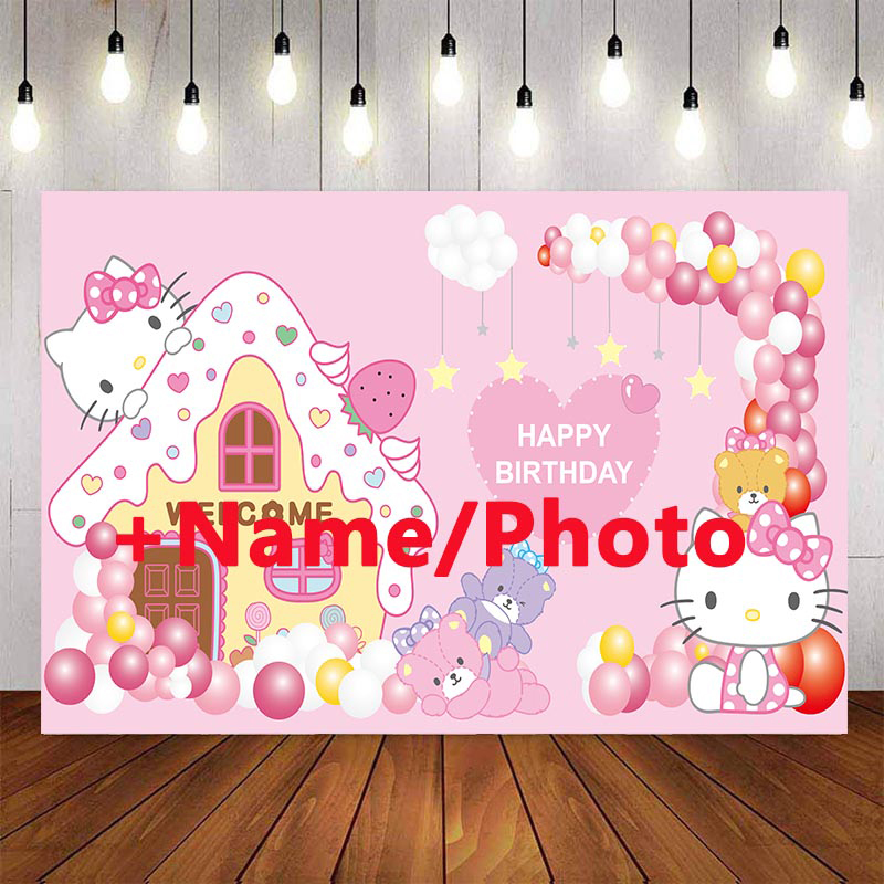 Hello Kitty Backdrop For Photography Baby Shower Kids Girls Cartoon Pink Background Birthday Party Decor Custom Name Photo