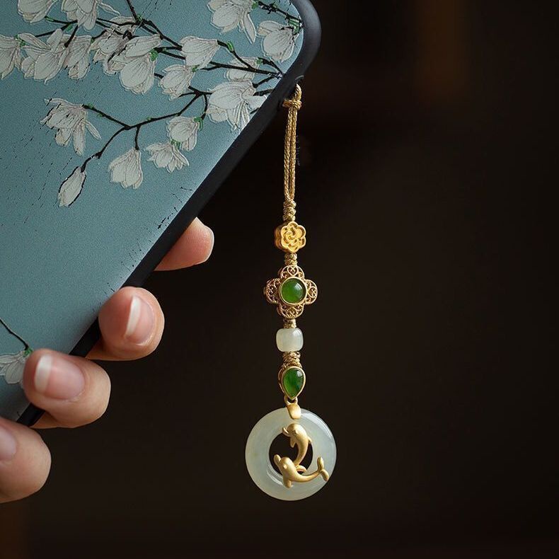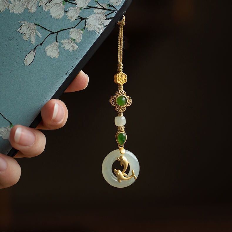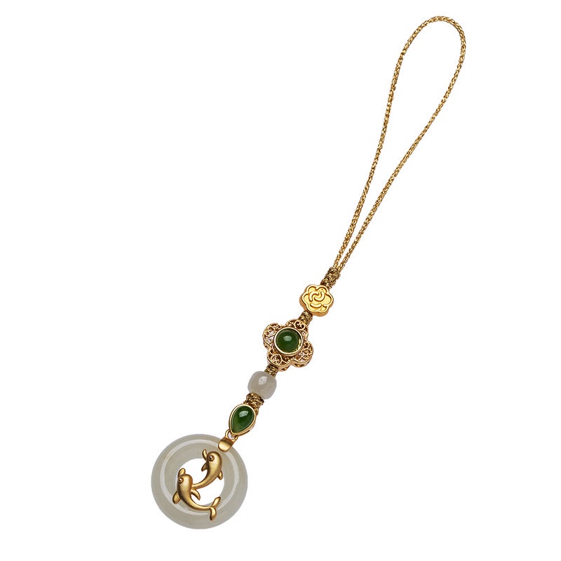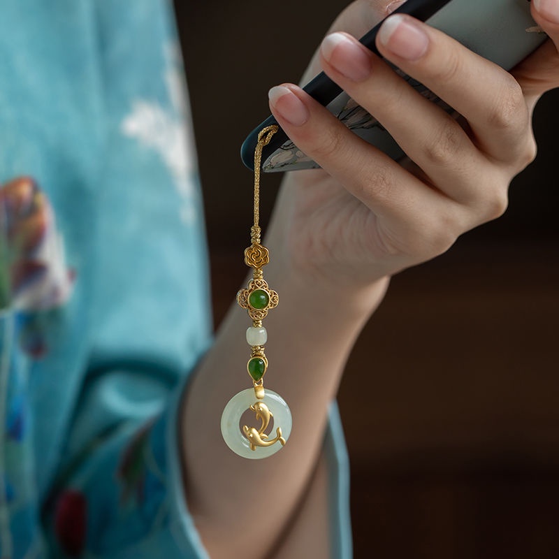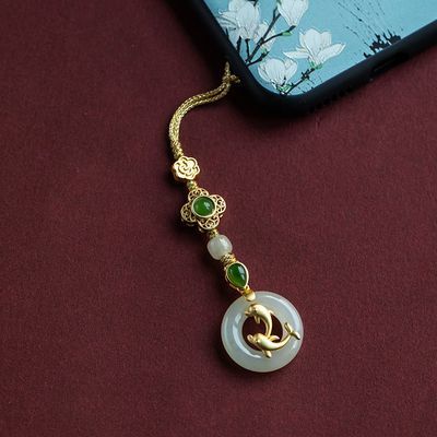 High-End Hetian Jade Safe Buckle Phone Chain Sterling Silver Ancient Method Golden Dolphin Pendant Jewelry Female Gift