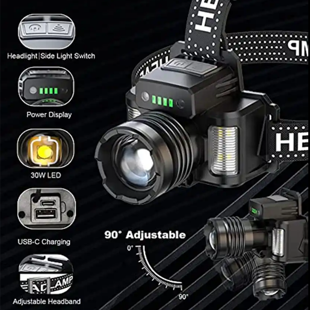 High Power Headlamp Rechargeable Headlight 30W LED Beads Wave Sensors Built in Battery Long Range Head Lamp Fishing Camping Work