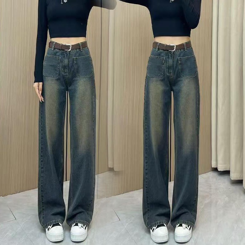 High Waist Wide Leg Jeans Women 2025 New Style Spring Hot-selling Contrast Color Slimmer Look Loose Narrow Version Straight Mopping Pants