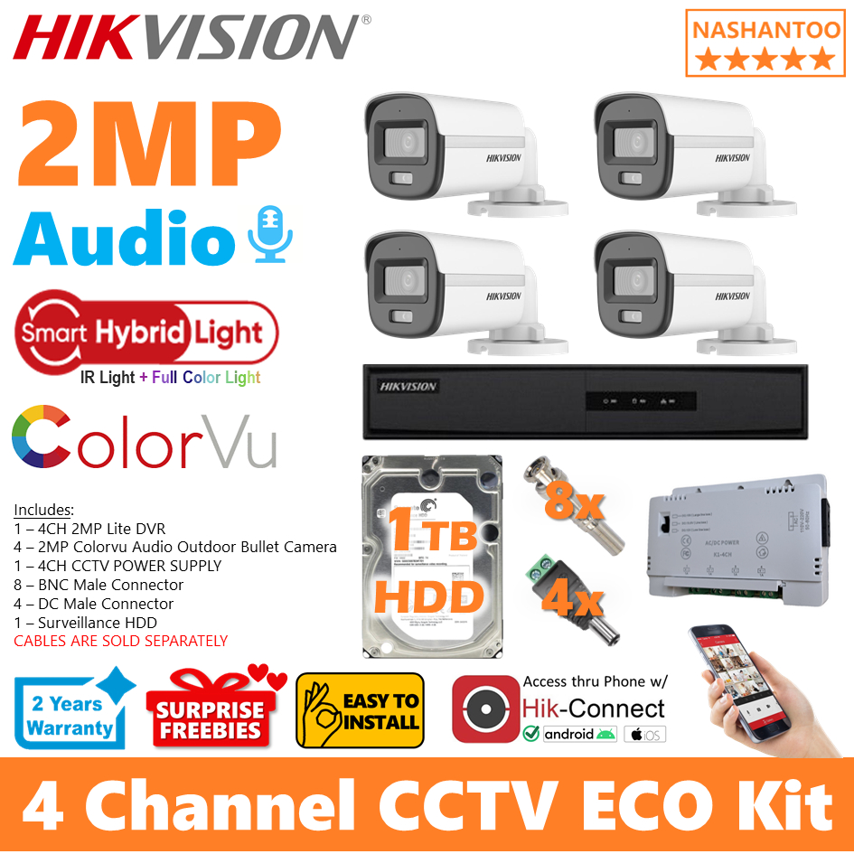 Hikvision 4CH 2MP Colorvu Audio 4Camera Outdoor DIY CCTV Package Kit 4/4CRA2 ECO-HKPS(4B)