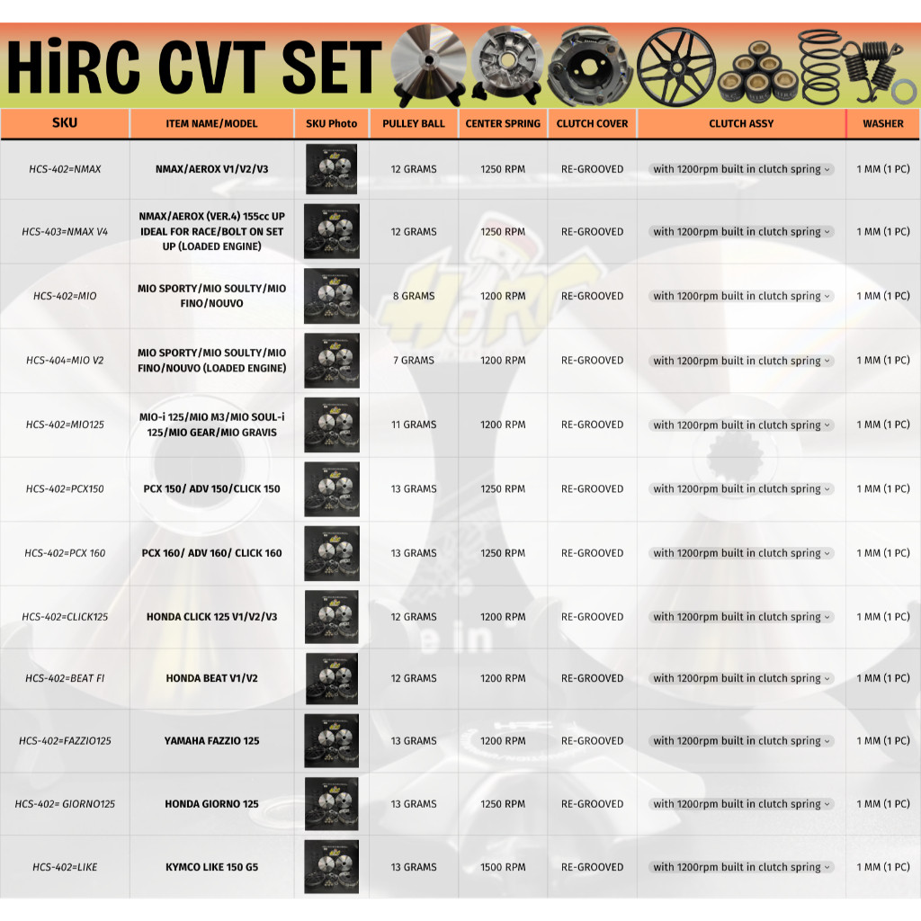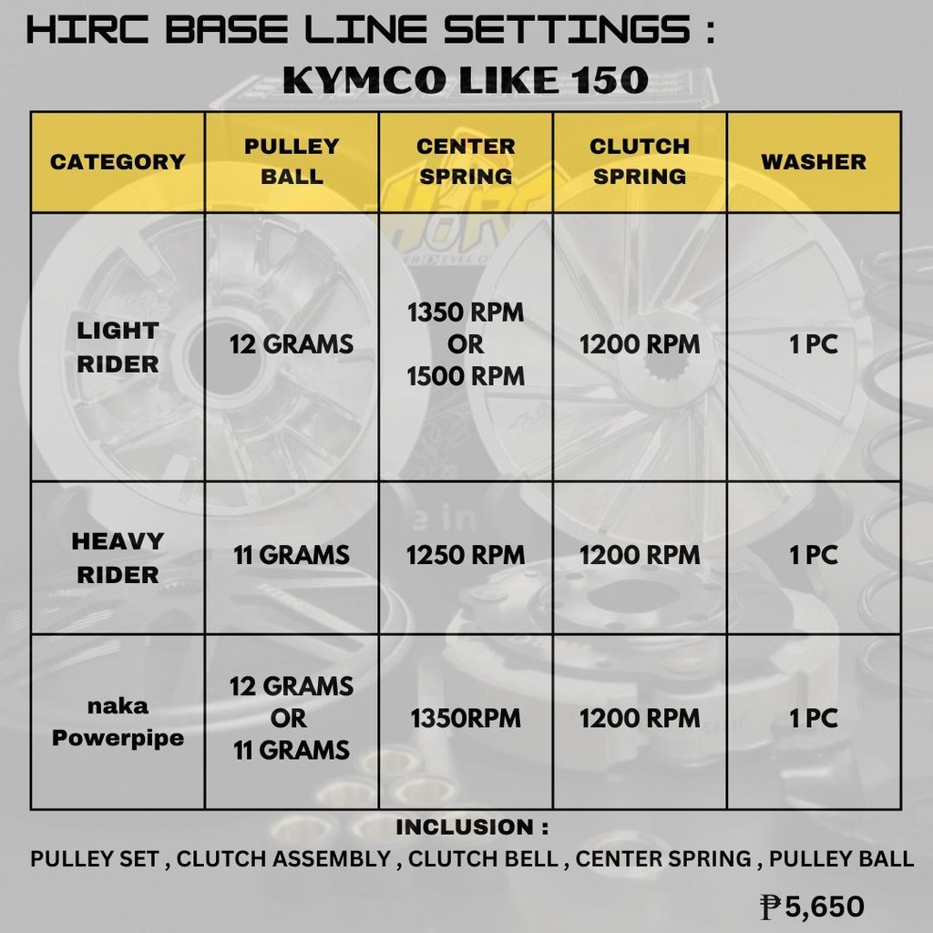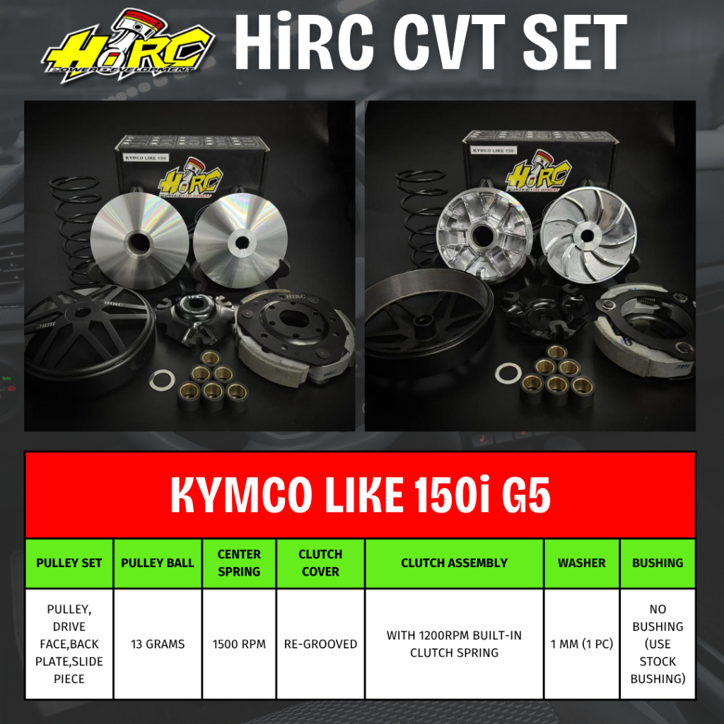 Hirc CVT SET Complete set for KYMCO LIKE 150 G5 (Degree: 14)13GRAMS/1500RPM-NO BUSHING