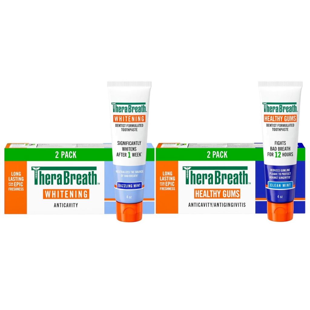 TheraBreath Toothpaste 4oz Pack of 2 (Whitening Dazzling Mint / Healthy Gums Clean Mint)