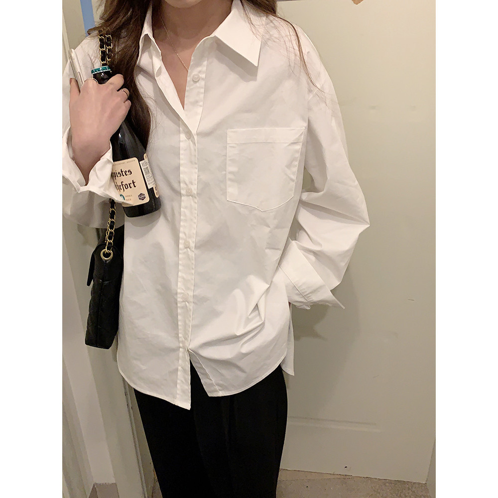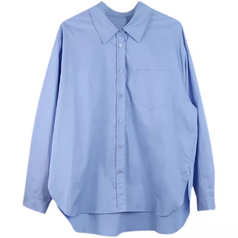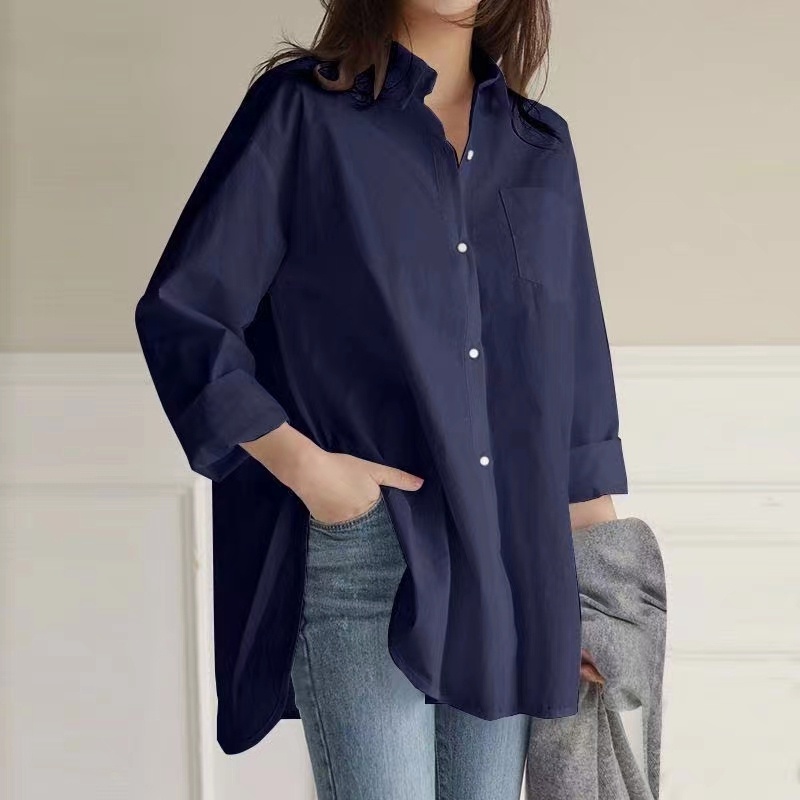 {Shipped From Manila+COD} Blue Blouse for Women POLO Lapel Neck Button Up Long Sleeves Pockets Loose Boyfreind Style Oversized Side Slit Solid Color Basic Casual Shirts Tops S-3XL