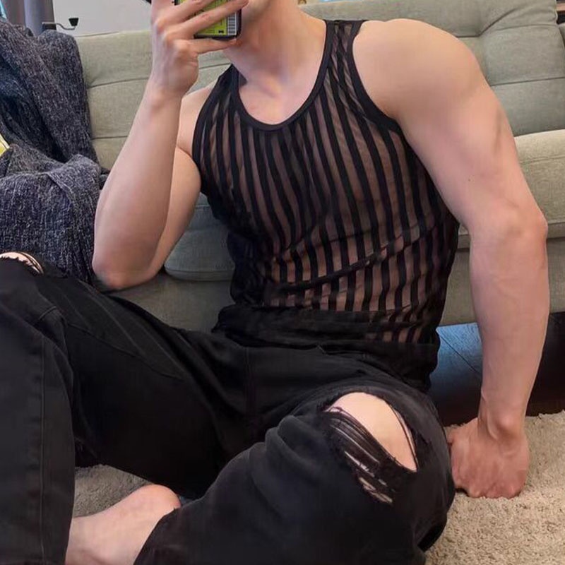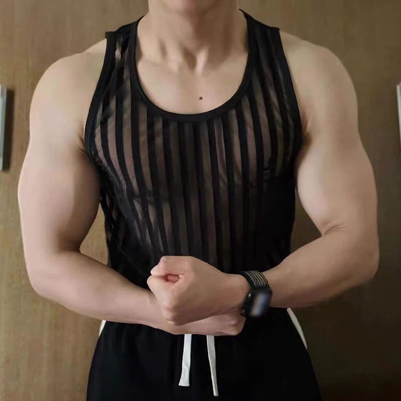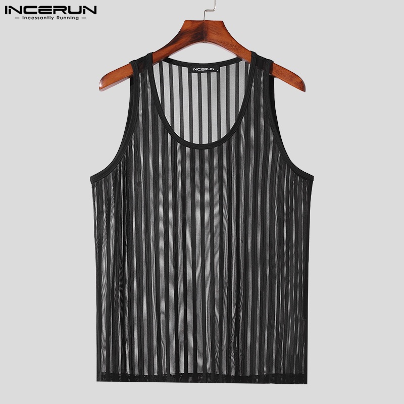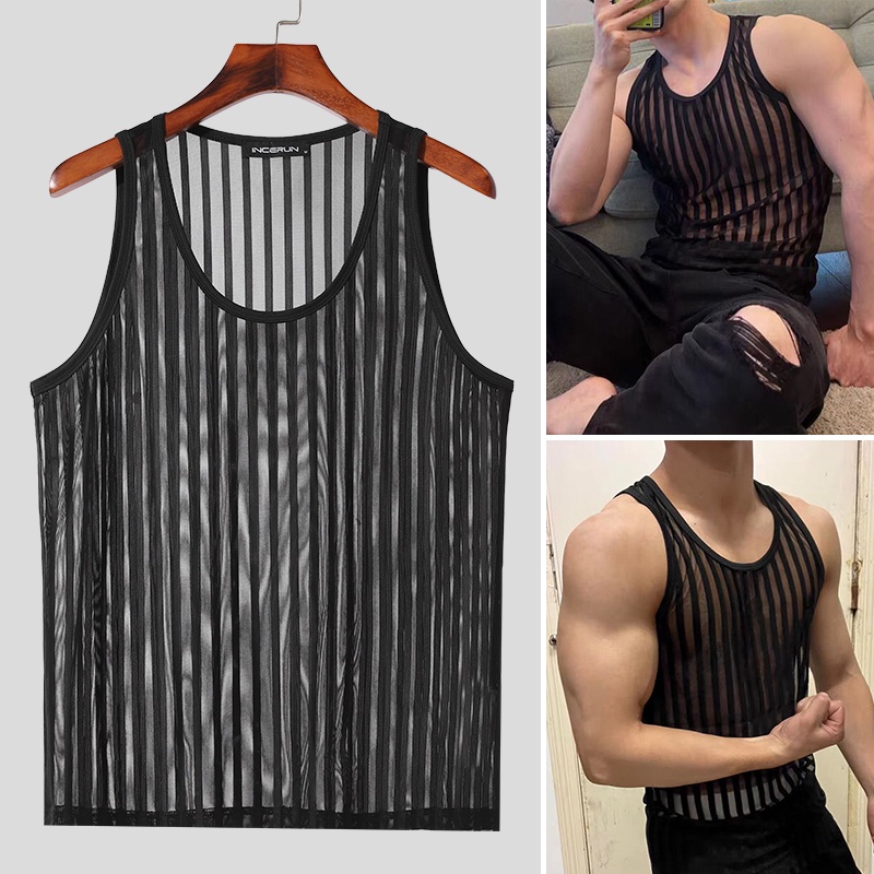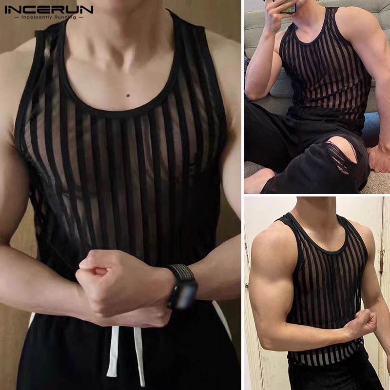 INCERUN Men's Tight Striped Mesh Backing Sleeveless Tank Top