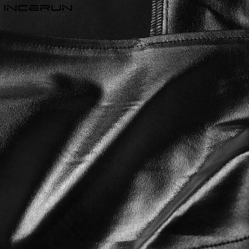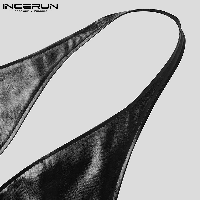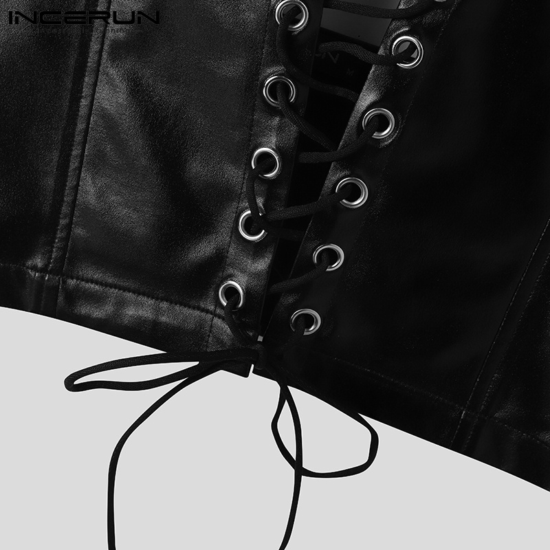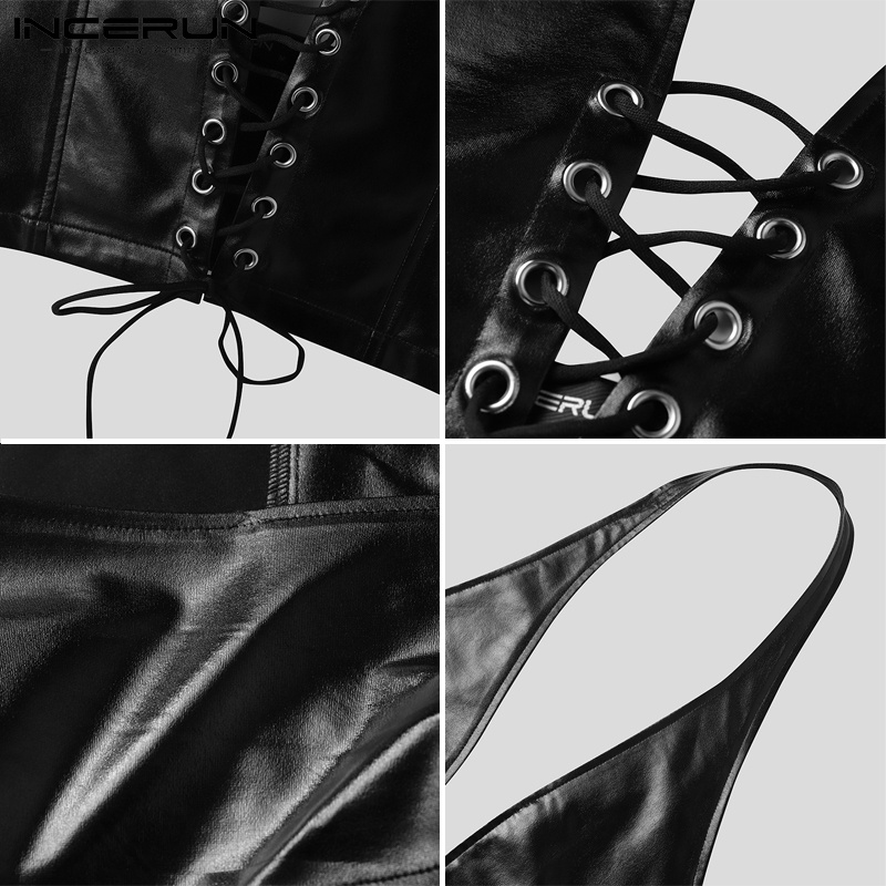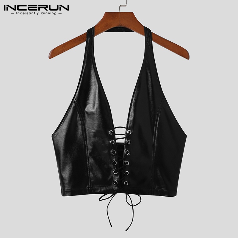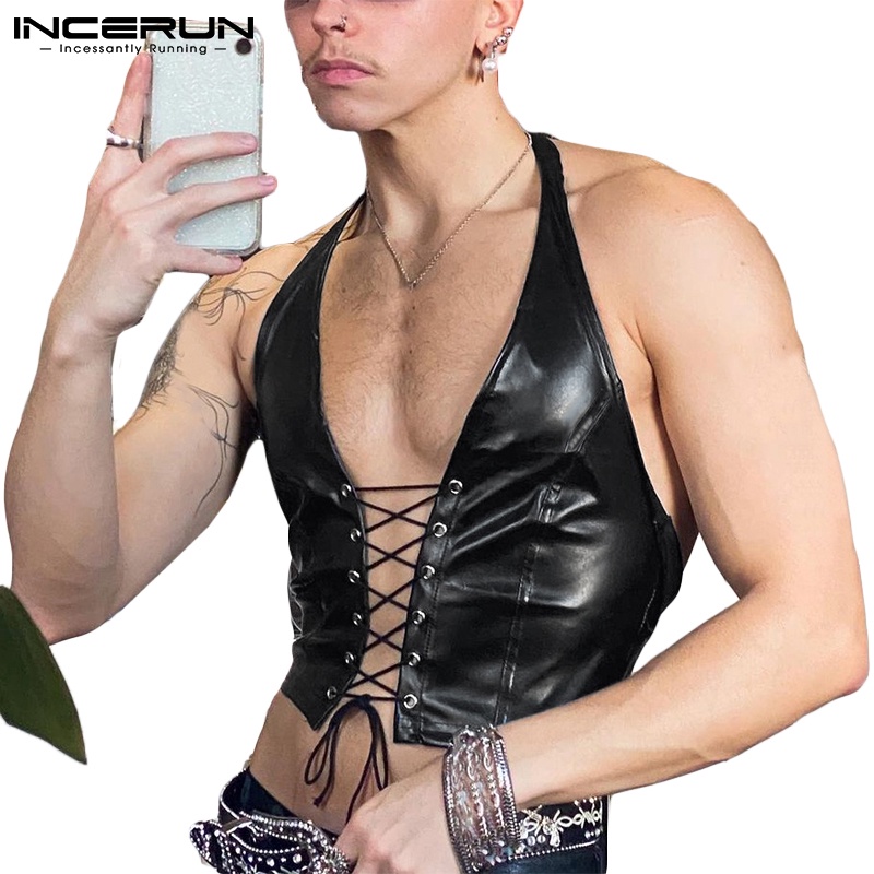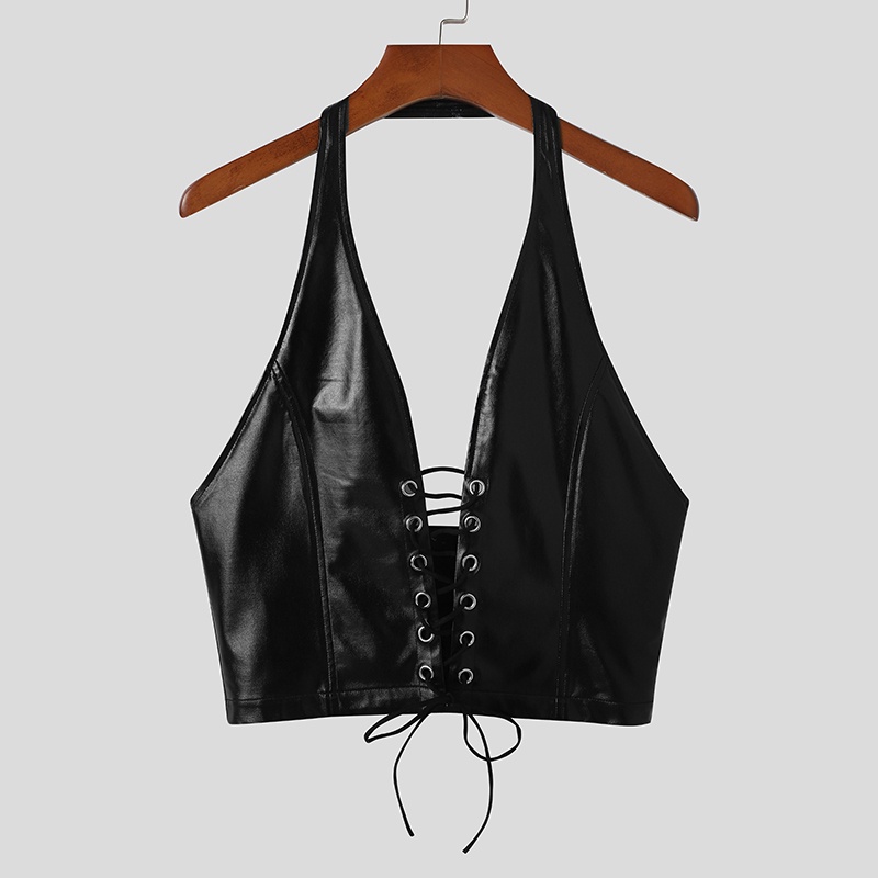 INCERUN Men Fashion Lace Up Halter Neck Slim Fit Leather Crop Tank Top