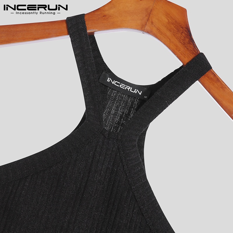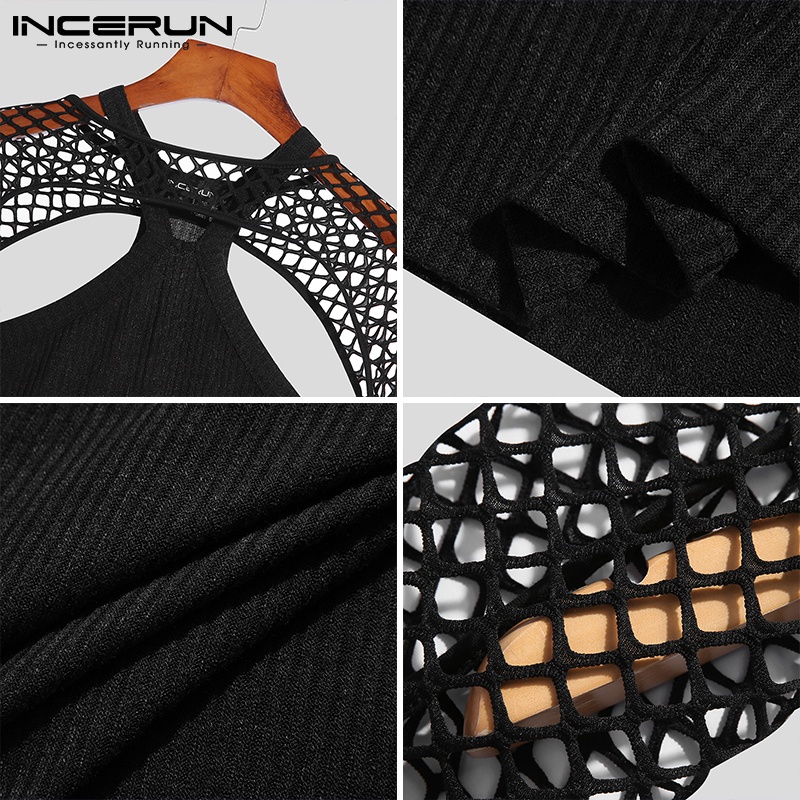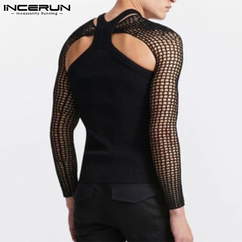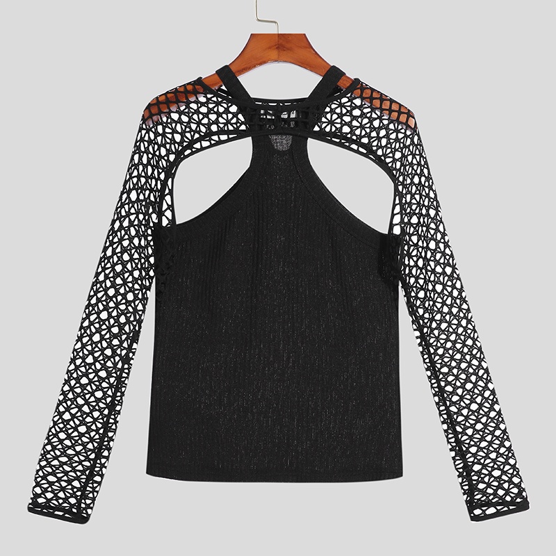 INCERUN Men Fashion Mesh See Through Long Sleeve Crop Tops+Sleeveless Round Neck Tank Top Set