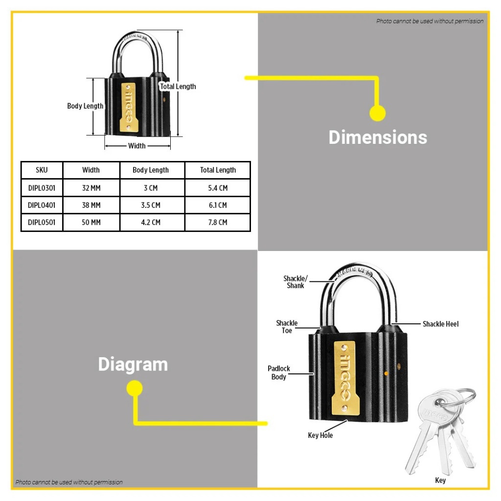 INGCO 32mm-50mm Iron Padlock Short Shackle with 3pcs Iron Keys Anti-Theft Pad Lock -TFM-HT2