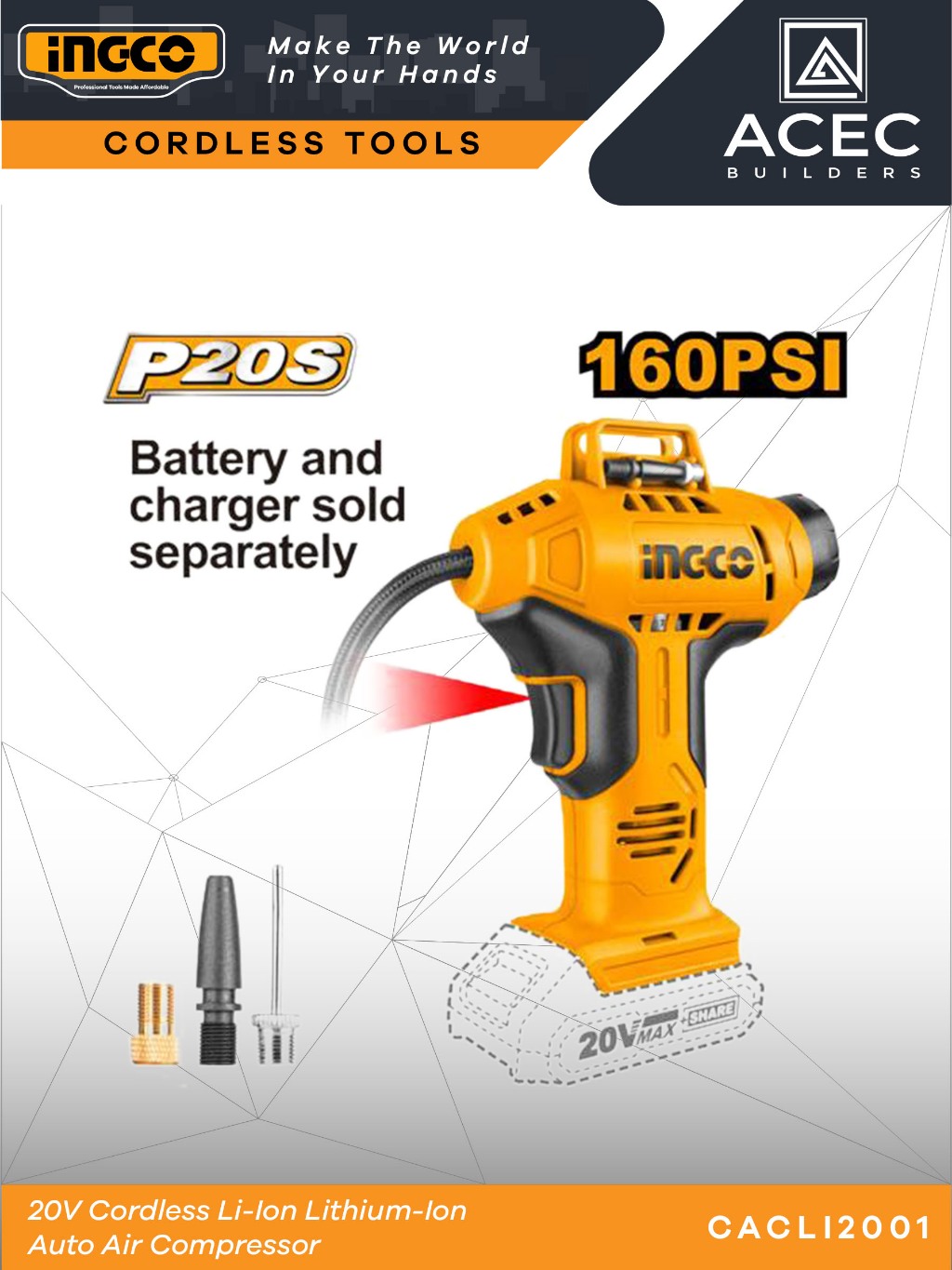 INGCO Cordless Li-Ion Lithium-Ion Auto Air Compressor CACLI2001 20V