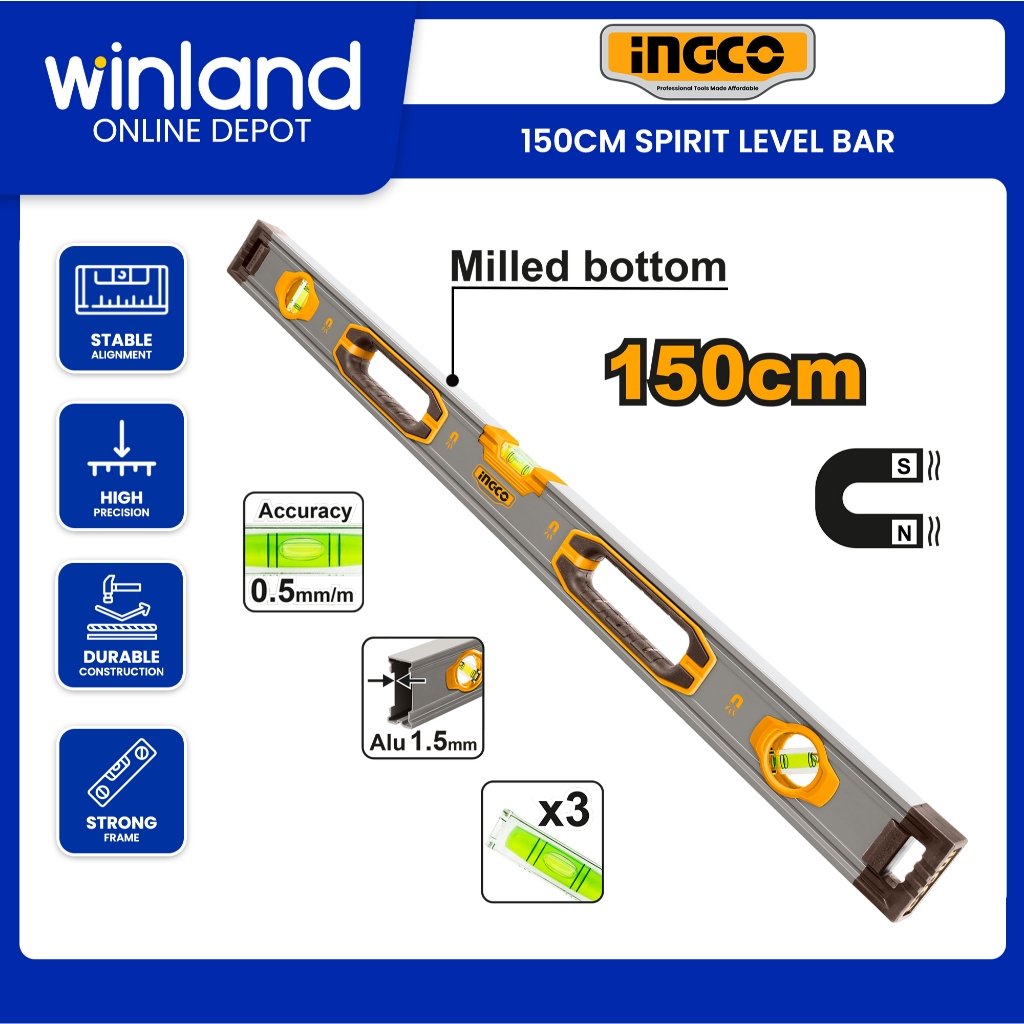 Ingco by Winland Spirit Level bar with Powerful Aluminum Magnetics 150cm HSL38150M ING-HT