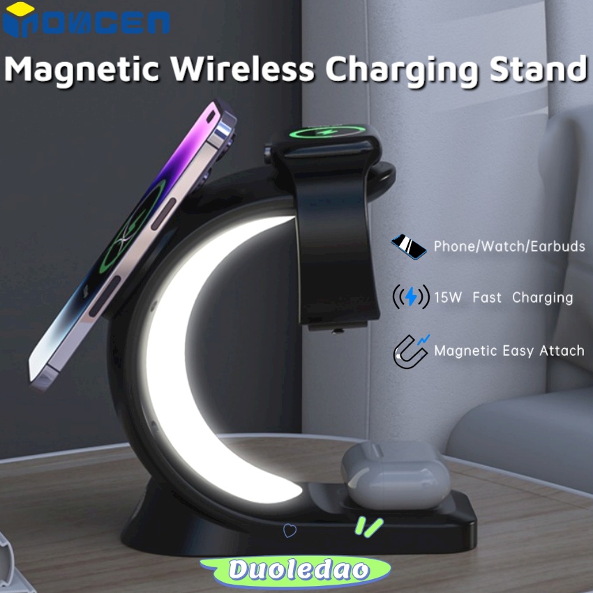 INOVAGEN Magnetic 15W Fast Charging Stand With RGB Light,For Phone,SmartWatch,Earbuds Desk Charging Dock,3 in 1 Wireless Charging Station
