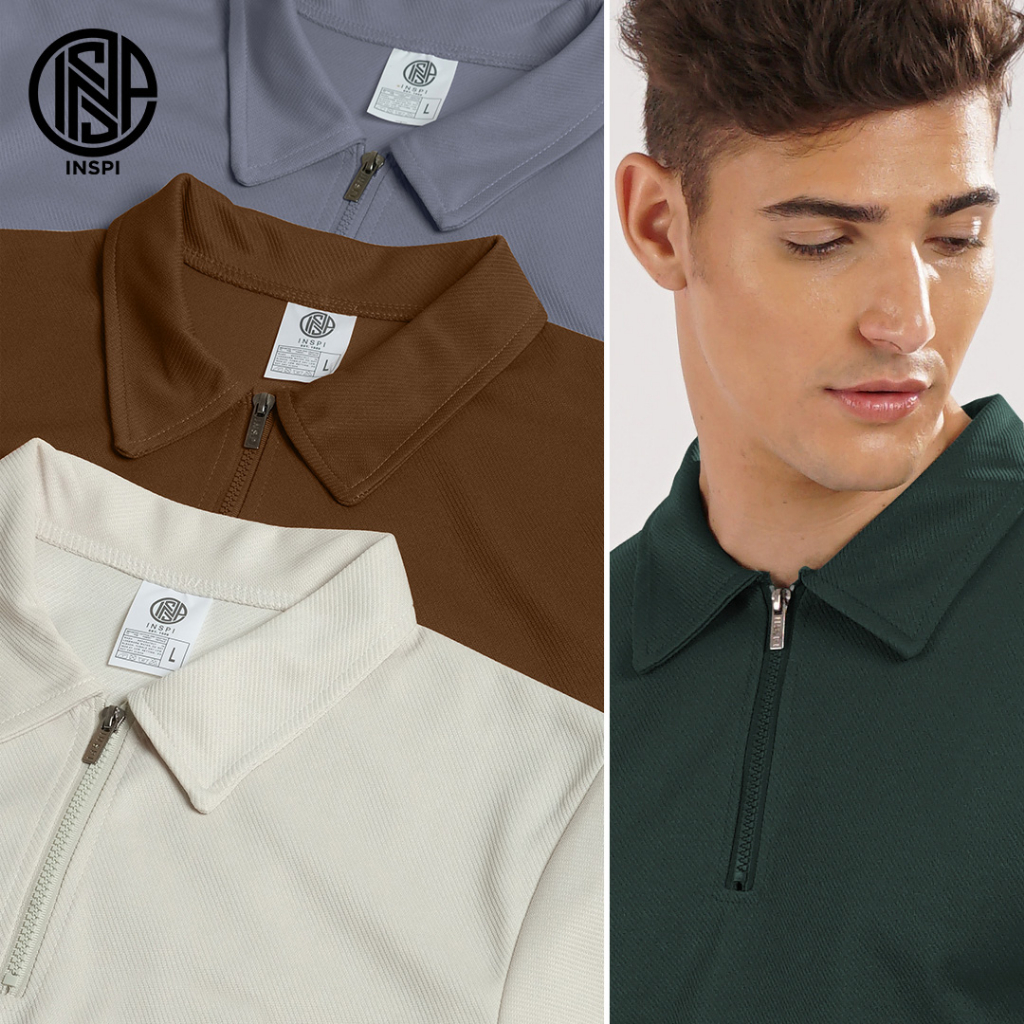 INSPI Zip Up Polo Shirt for Men with Half Zipper and Collar Casual Plain Korean Style Basic Tops