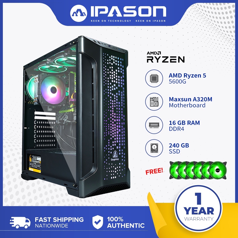 IPASON Gaming PC Ryzen 5 5600G 16G&8GB 1TB D4 Radeon Vega 7 Graphics 240G&256 SSD Desktop Computer