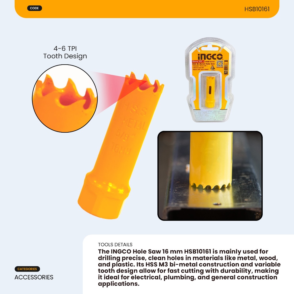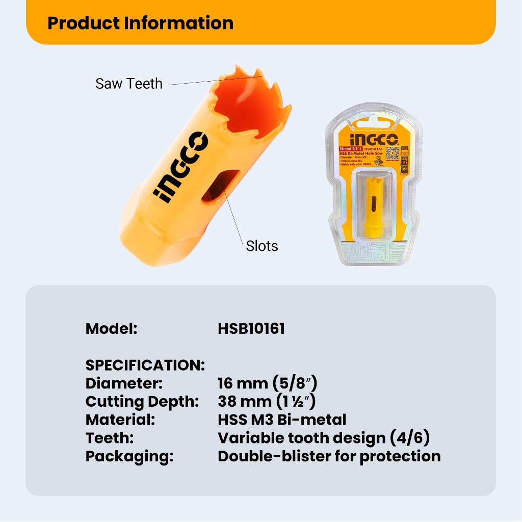 Ingco 16mm Hole Saw with HSS M3 Bi-Metal Material HSB10161 IHT