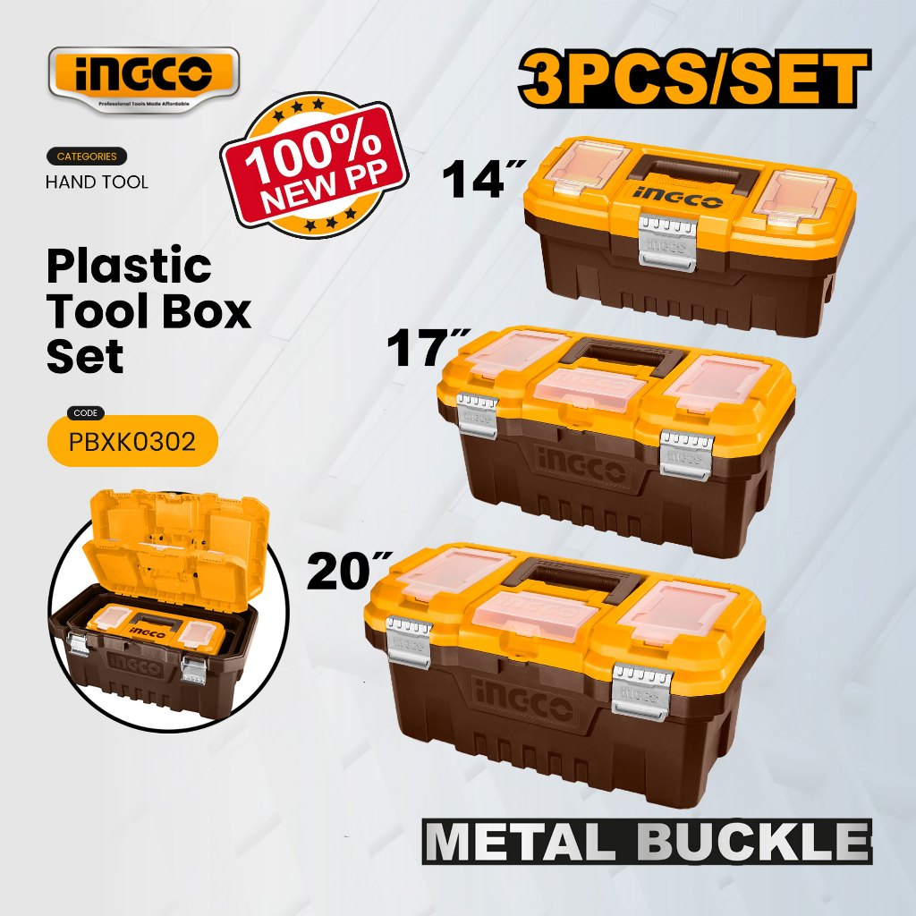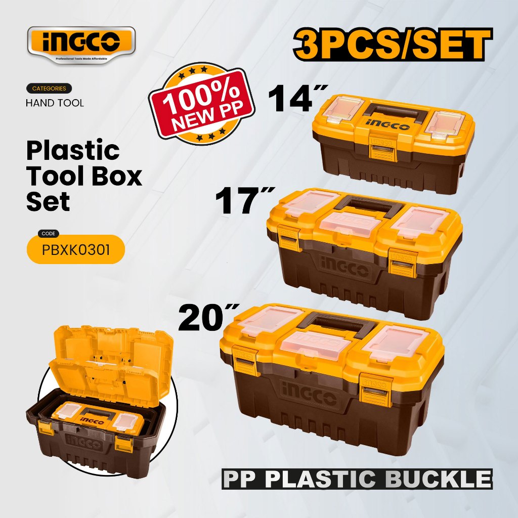 Ingco 3pcs Plastic/Metal Latch Tool Box Set with Tray Plastic Organizer Storage Boxes Toolkit - HT2