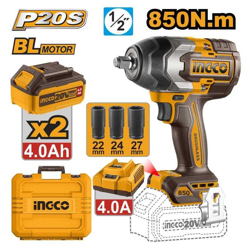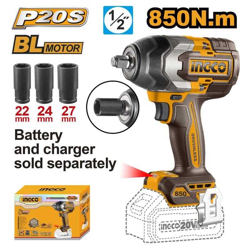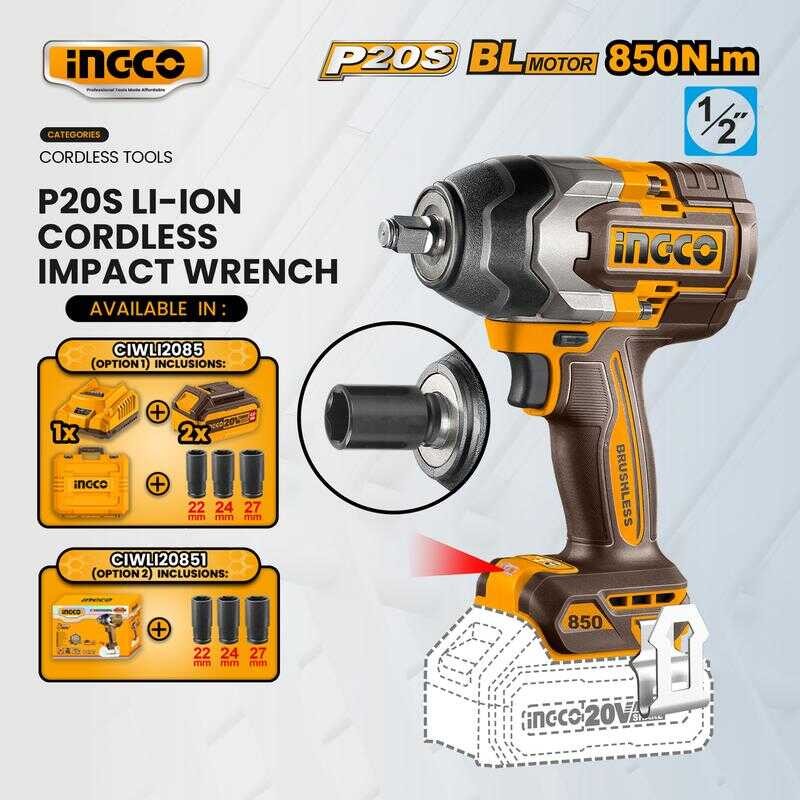 Ingco P20 Series Li-Ion Cordless Brushless 20V Impact Wrench 850Nm Max Torque Ciwli2085 | Ciwli