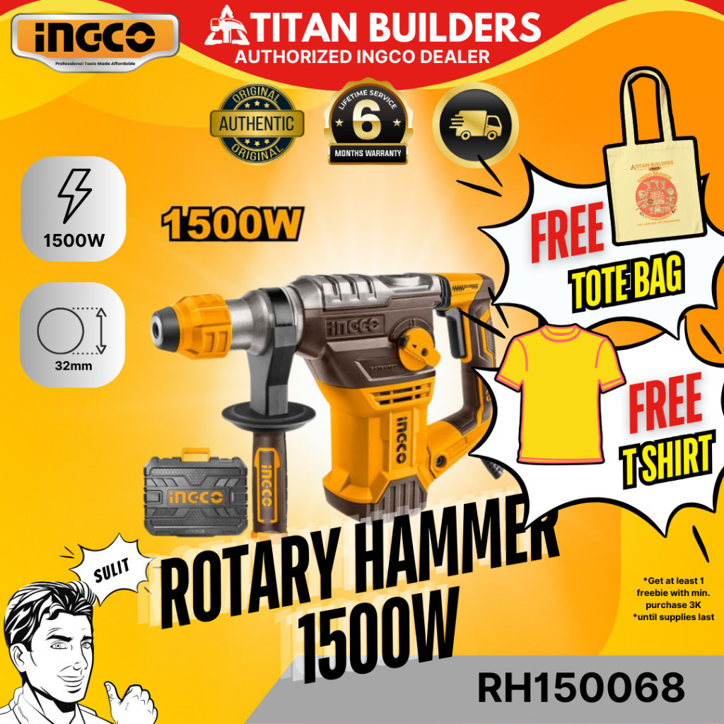 Ingco by Titan Rotary Hammer 1500W 5.5J, 32mm Concrete SDS Plus, Chisel Locking 3 Drills 2 Chisels