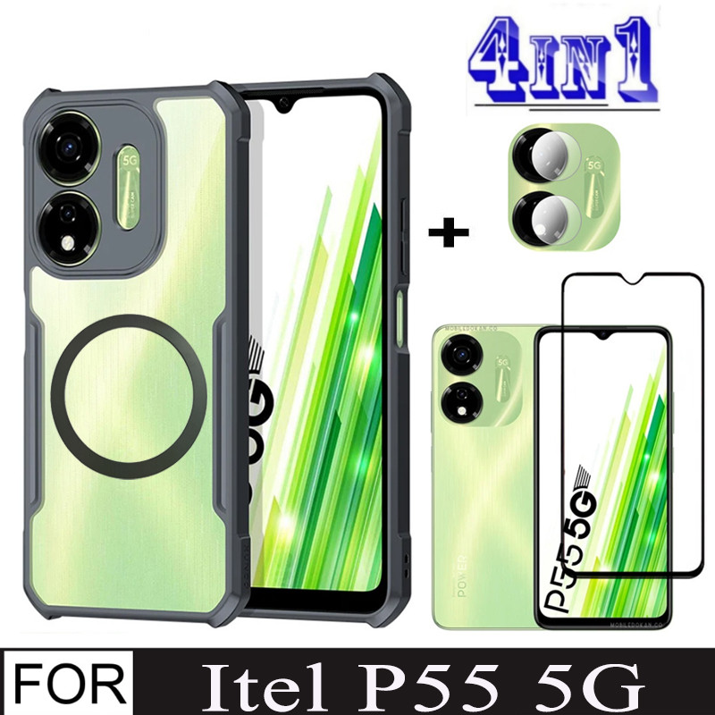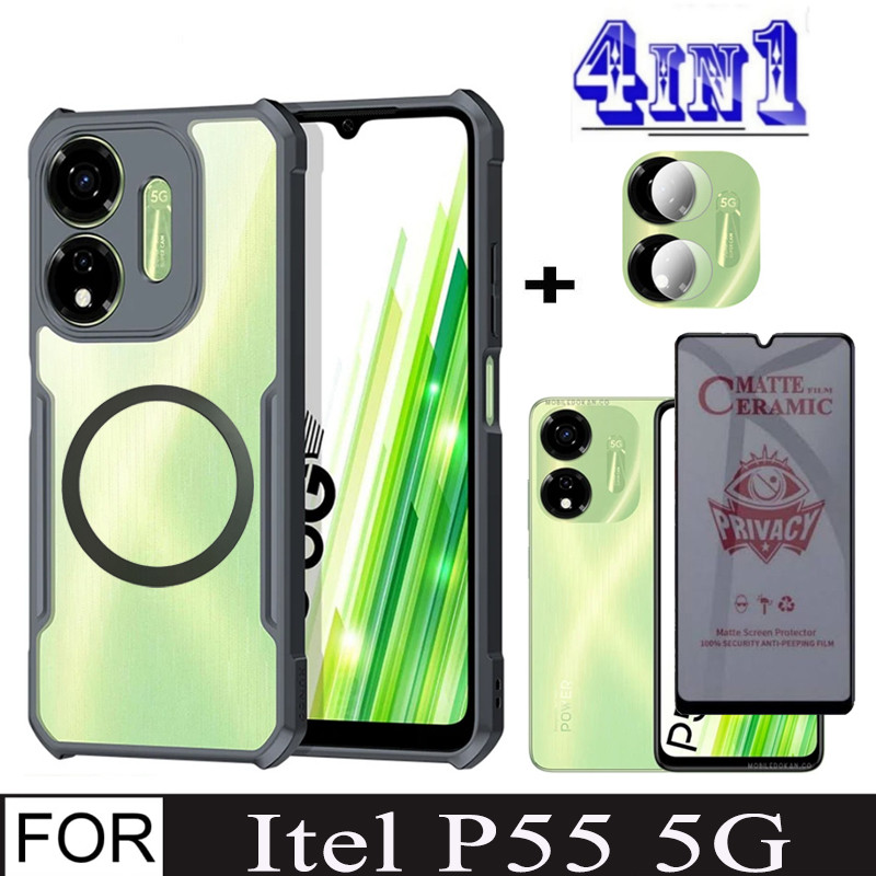 Itel P55 5G Shockproof Phone Case for itel A50 A70 A60 S23 P65 Privacy Tempered Glass Film + With Magnetic Wireless Charging Sticker