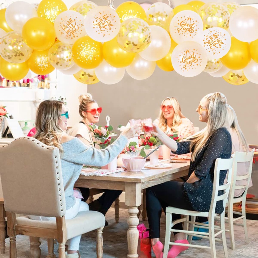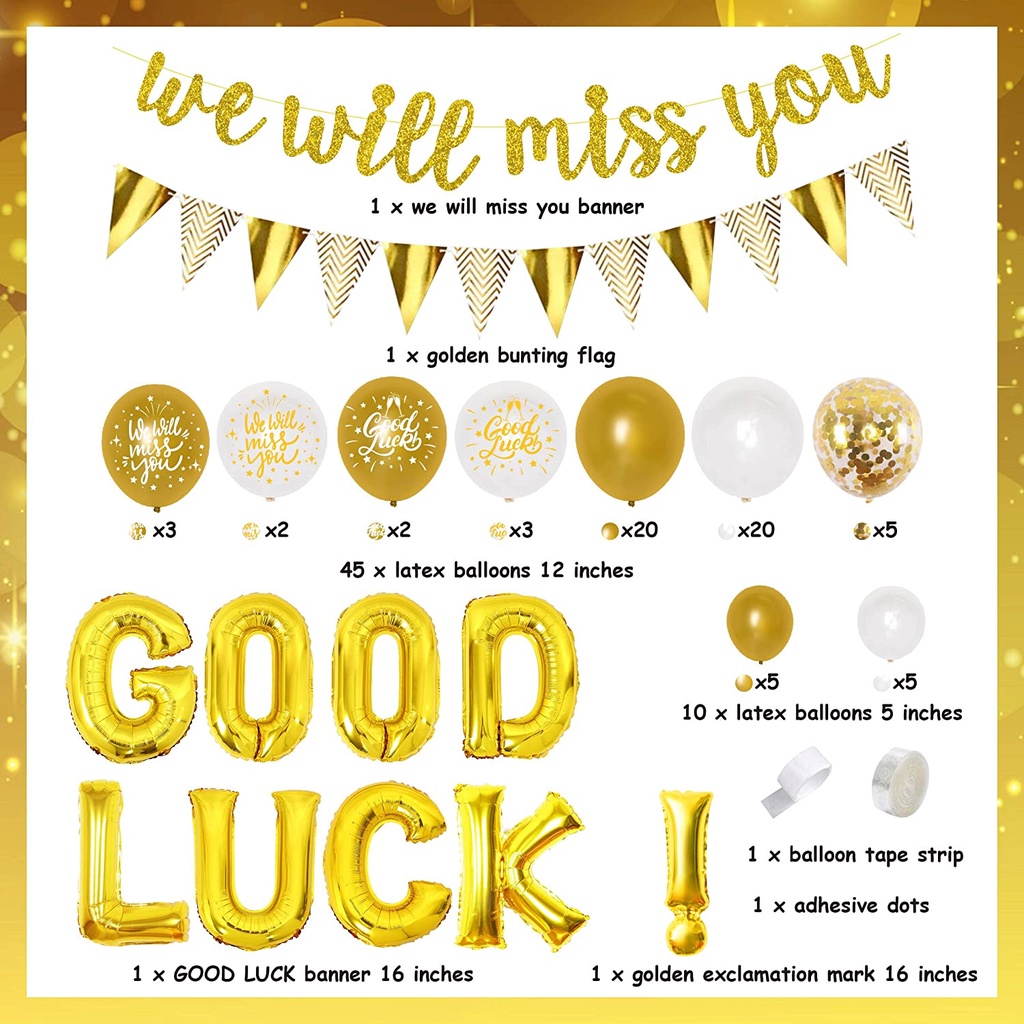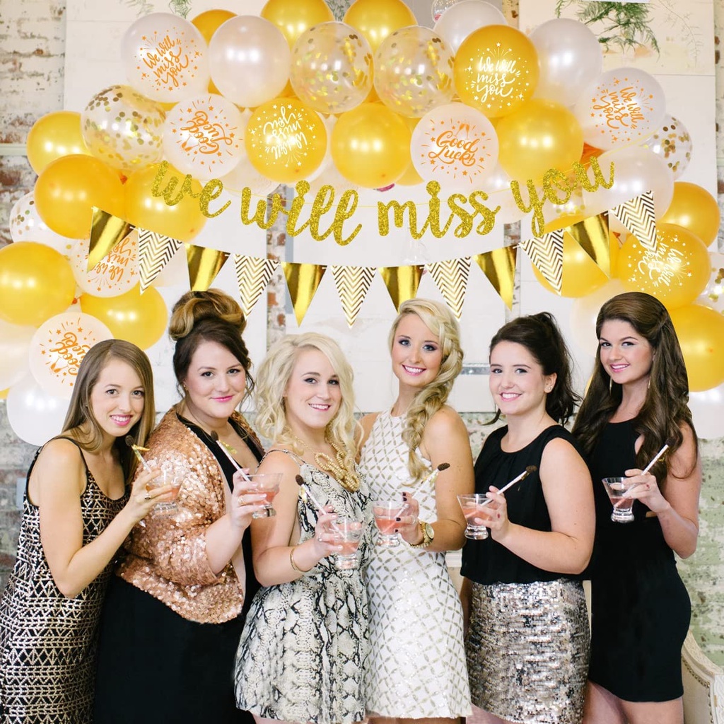 JOLLYBOOM We Will Miss You Party Decorations Gold Balloon Arch Kit with Printed Balloons, We Will Miss You, Good Luck Banner and Bunting Flag for Farewell Retirement Party Supplies