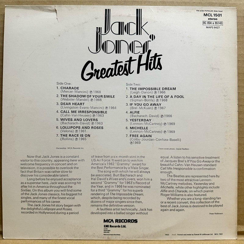 Jack Jones’ Greatest Hits LP (1974 UK MCA MCL 1501) Jazz Easy Listening Vinyl Compilation