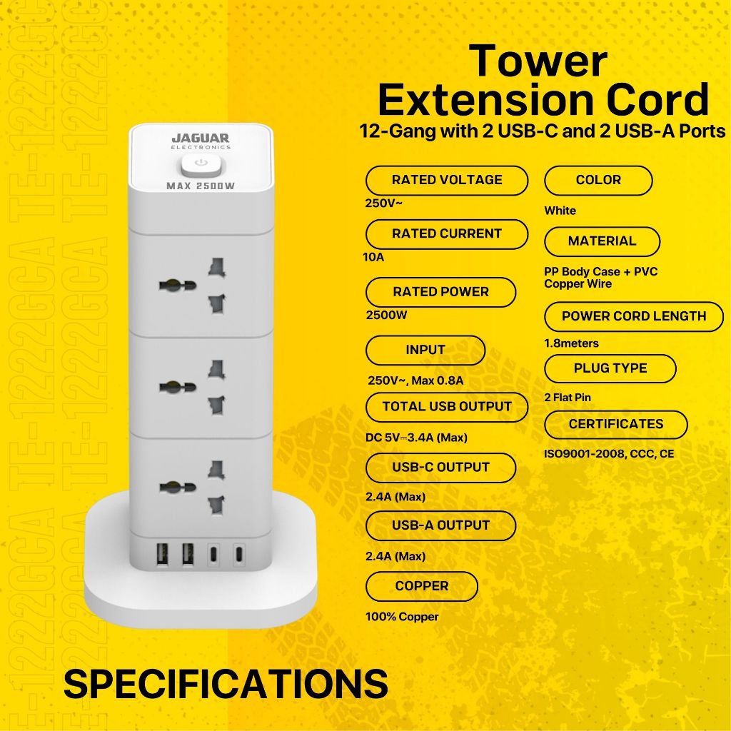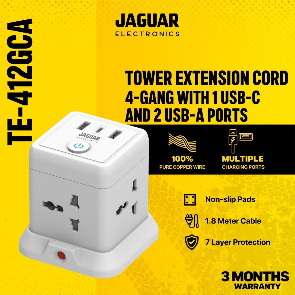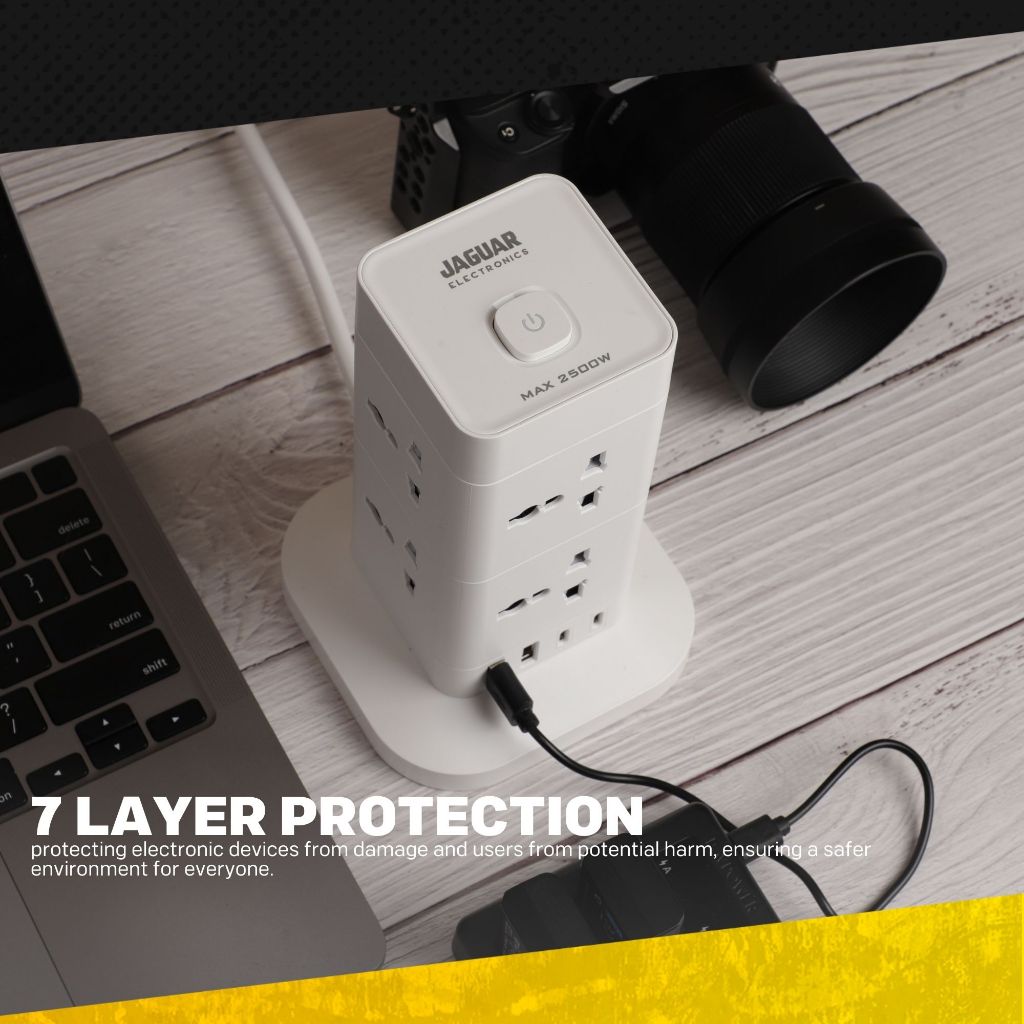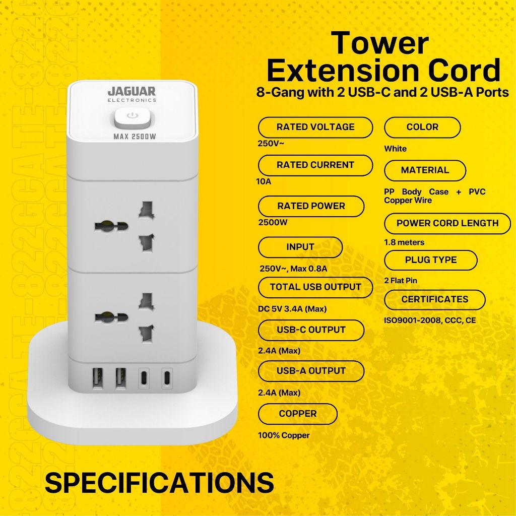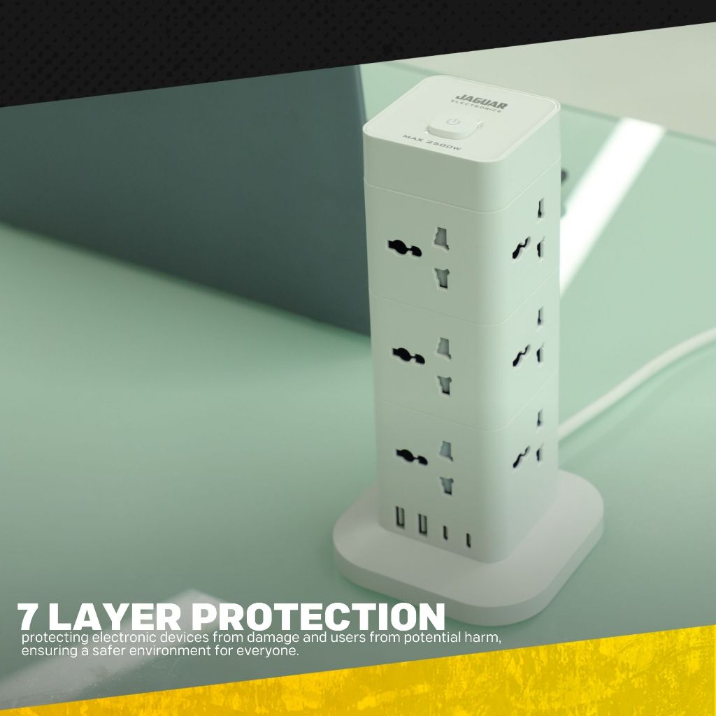 Jaguar Electronics Tower Extension Cord with USB-C and USB-A Ports Vertical Smart Socket