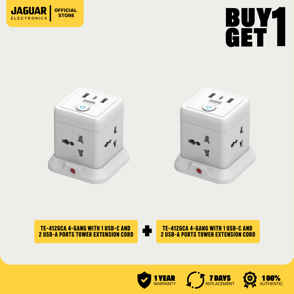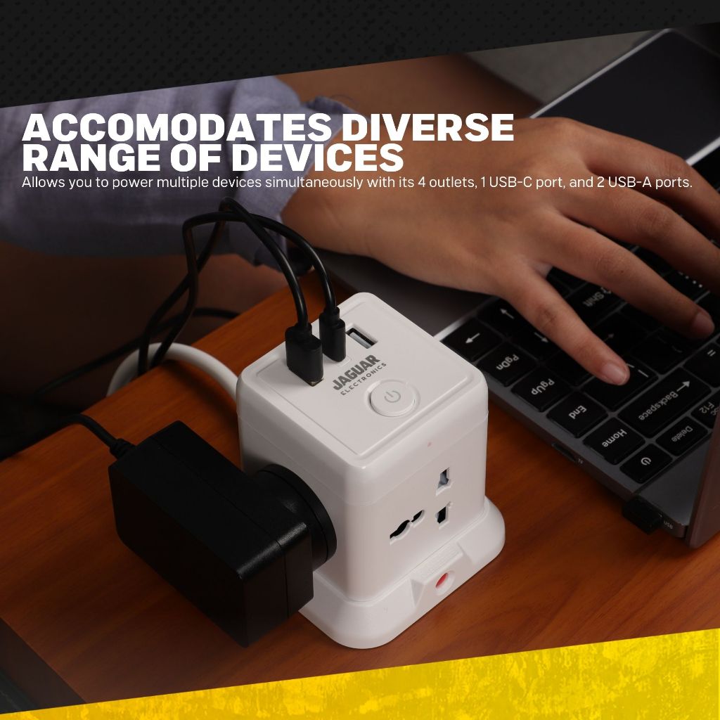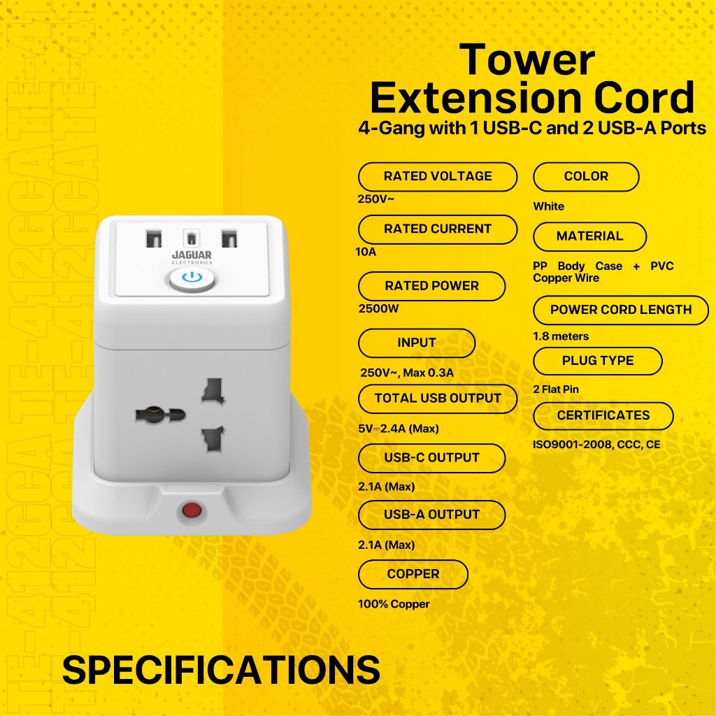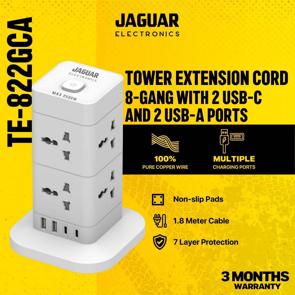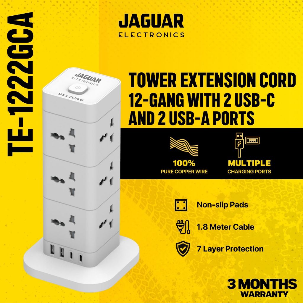 Jaguar Electronics Tower Extension Cord with USB-C and USB-A Ports Vertical Smart Socket