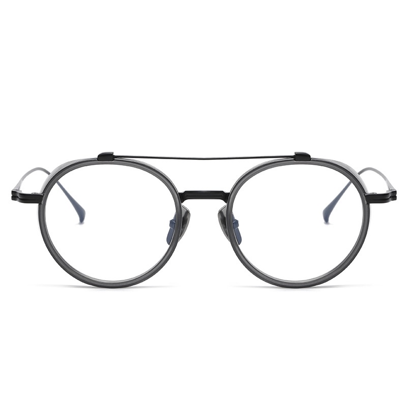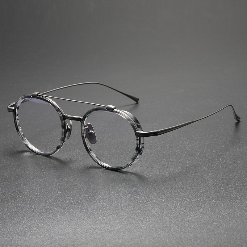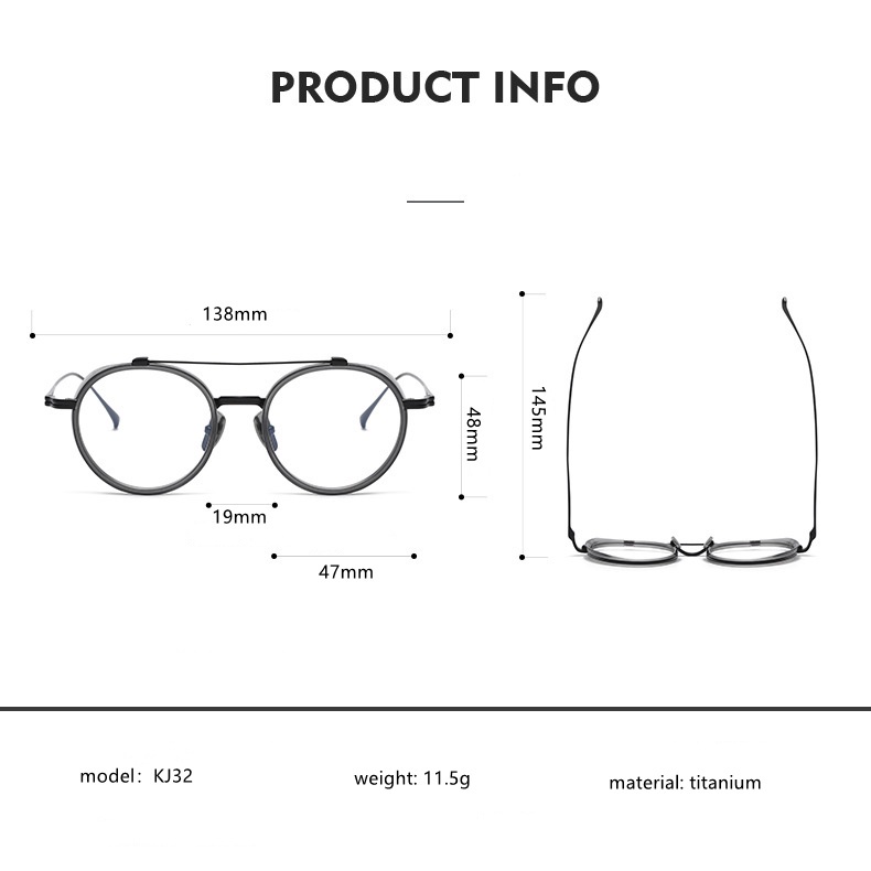 Japanese Style Vintage Double Beam Round Frame Glasses Acetate Fiber Frame+Pure Titanium Temple Leg Windshield Design Suitable For Height Myopia Jingjiang Gold KJ32