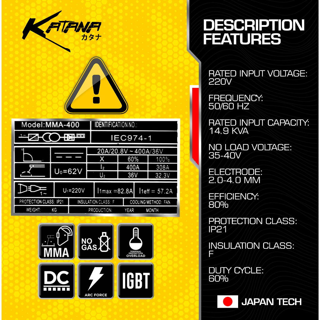 KATANA JAPAN BUNDLES Welding Machine MMA400 400 Amp KTN400 + Auto Darkening Welding Helmet +FREEBIES