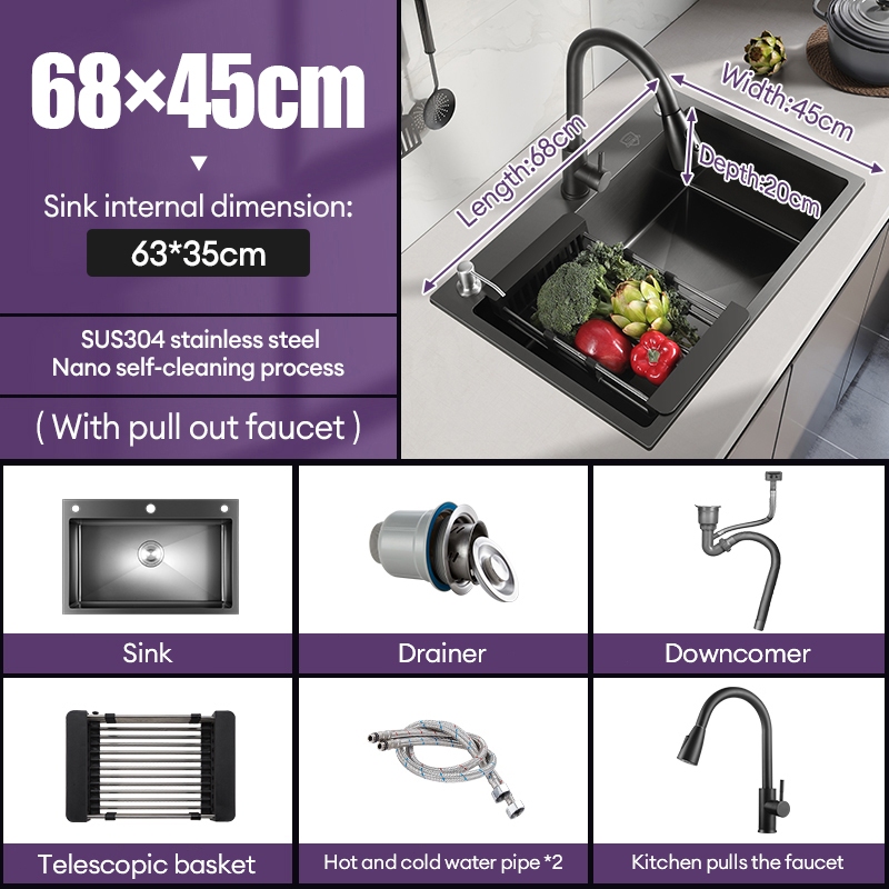 KEVE 304 Stainless Steel Black Kitchen Sink Complete Set Stainless Steel Lababo Double Sink Heavy Duty Small Single Sink