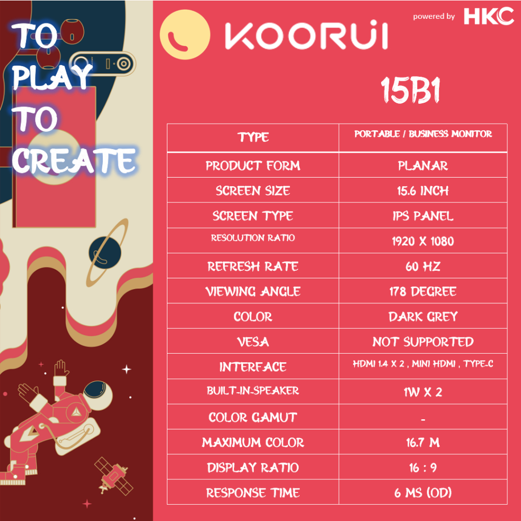 KOORUI 15B1 Portable Monitor 1080P FHD Portable Laptop Monitor Ips 15.6 Inch 60Hz refresh rate