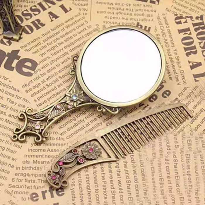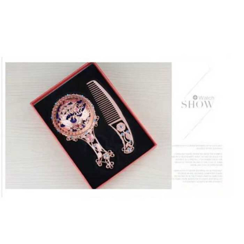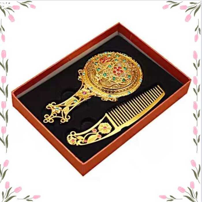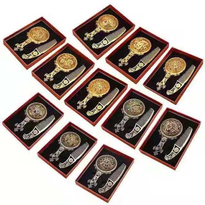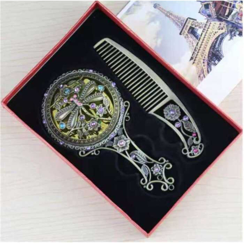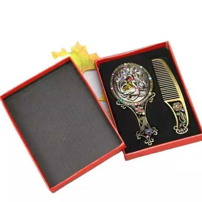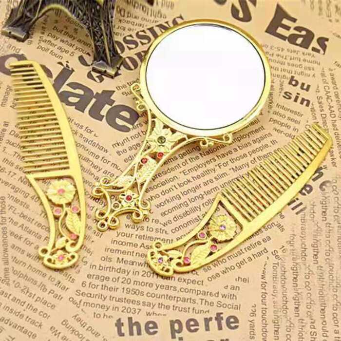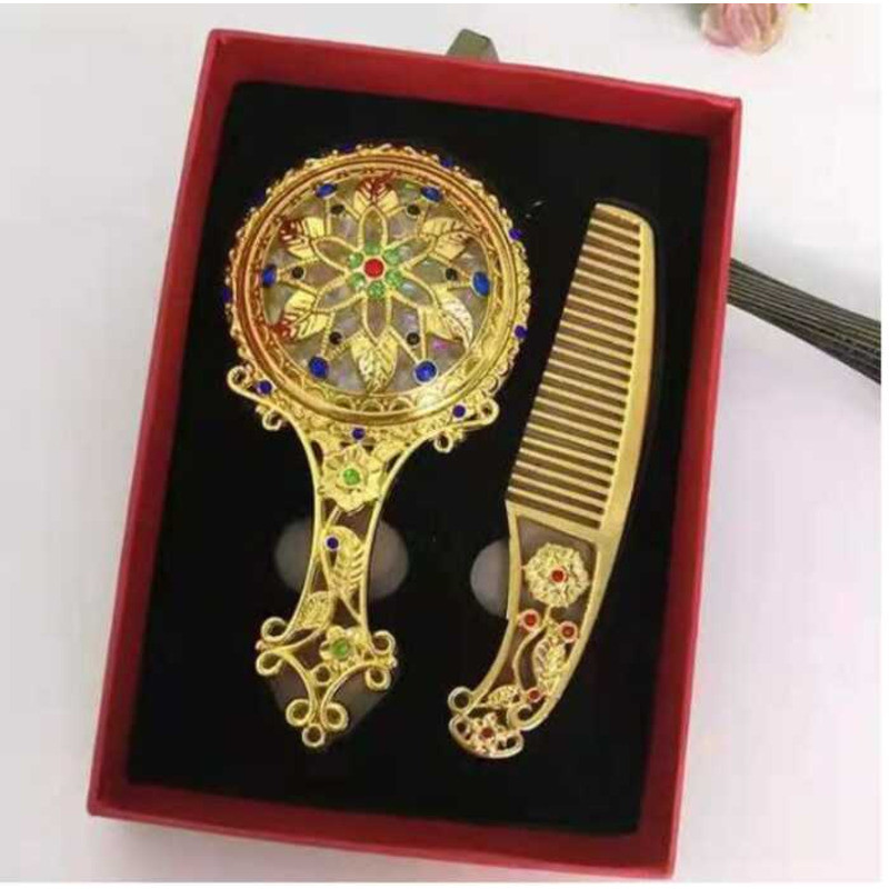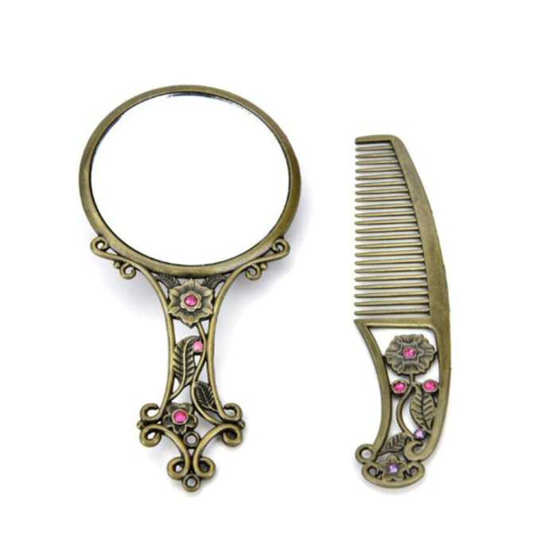 Hot Sale 2Pcs Bronze Handheld Hollow Makeup Mirror Comb Set Gift Box