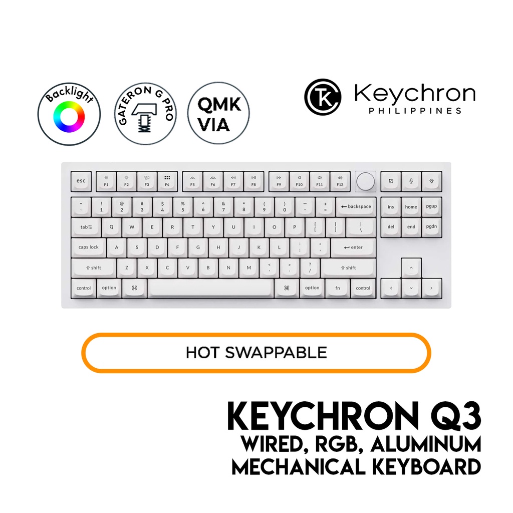 Keychron Q3 with Knob QMK Mechanical Keyboard, Shell White, TKL, Wired, RGB, Aluminum, Hot-Swap