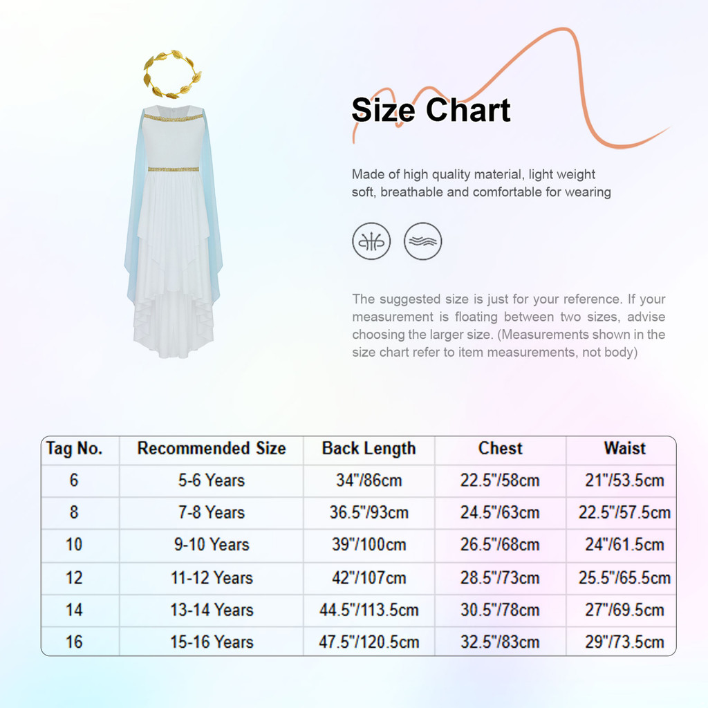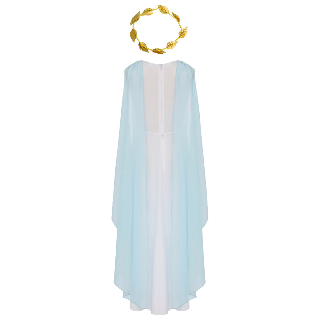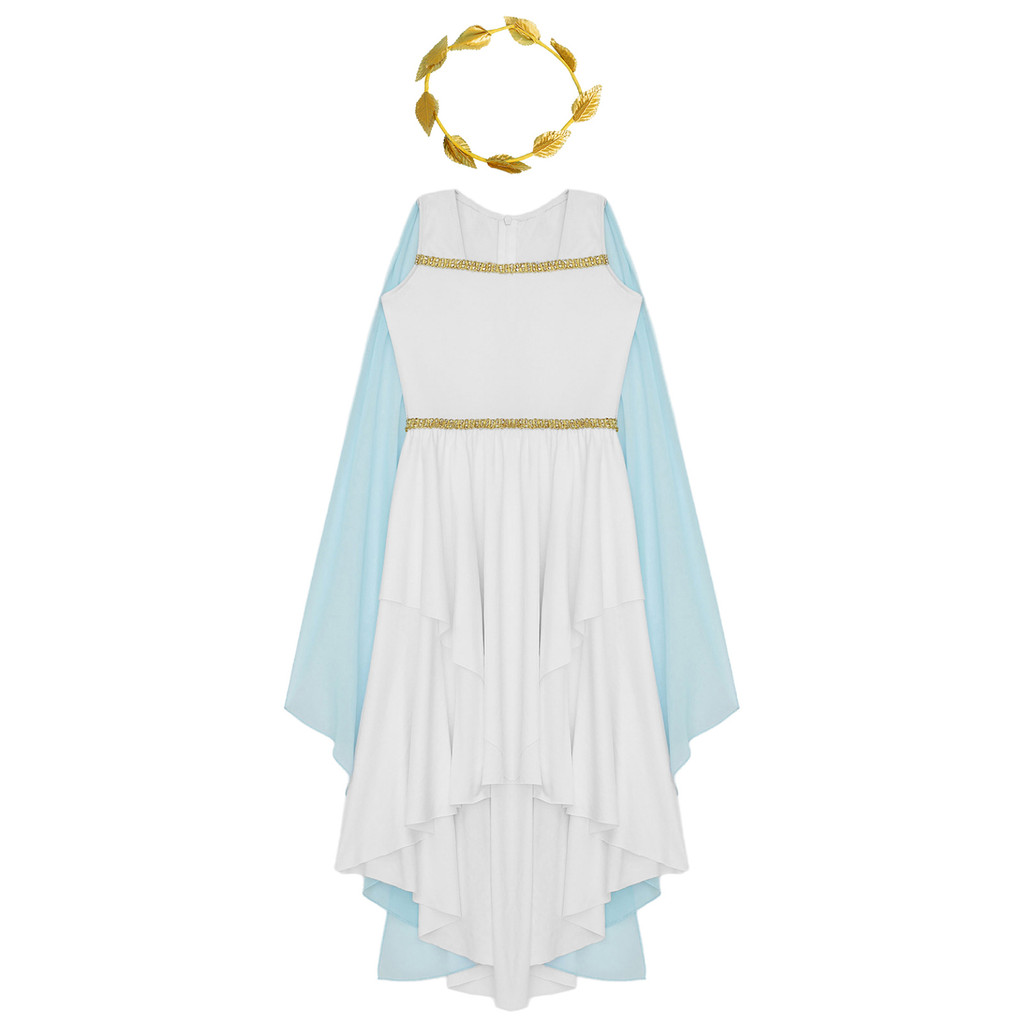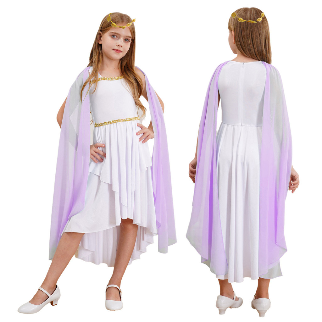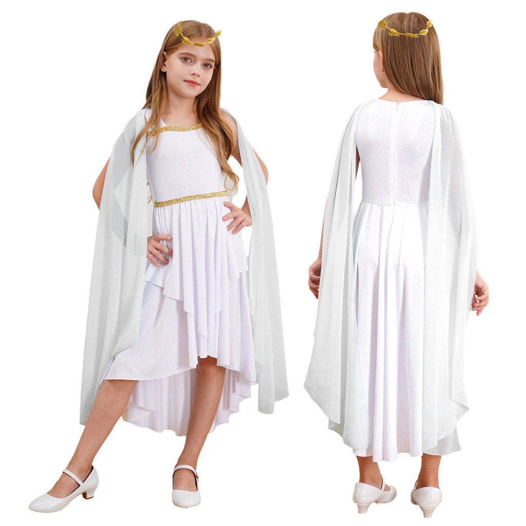 Kids Girls Halloween Ancient Greek Princess Athena Goddess Queen Cosplay Costume Roman Toga Cape Sleeve Zipper Dress with Wreath Headband Church Choir Worship Gown