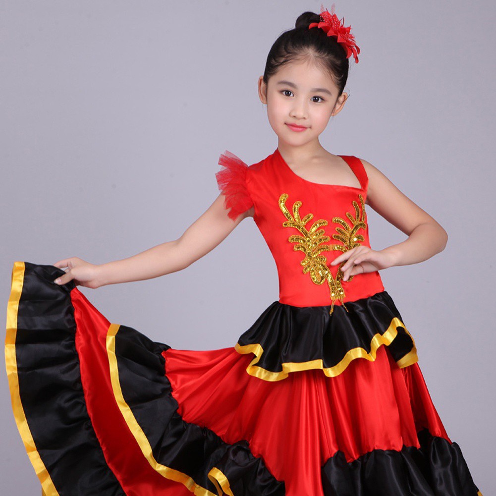 Kids Girls Red Spanish Flamenco Dress Belly Dance Costume Set School Activities Carnival Pageant Stage Performance Wear 3-12 Years kids professional costume