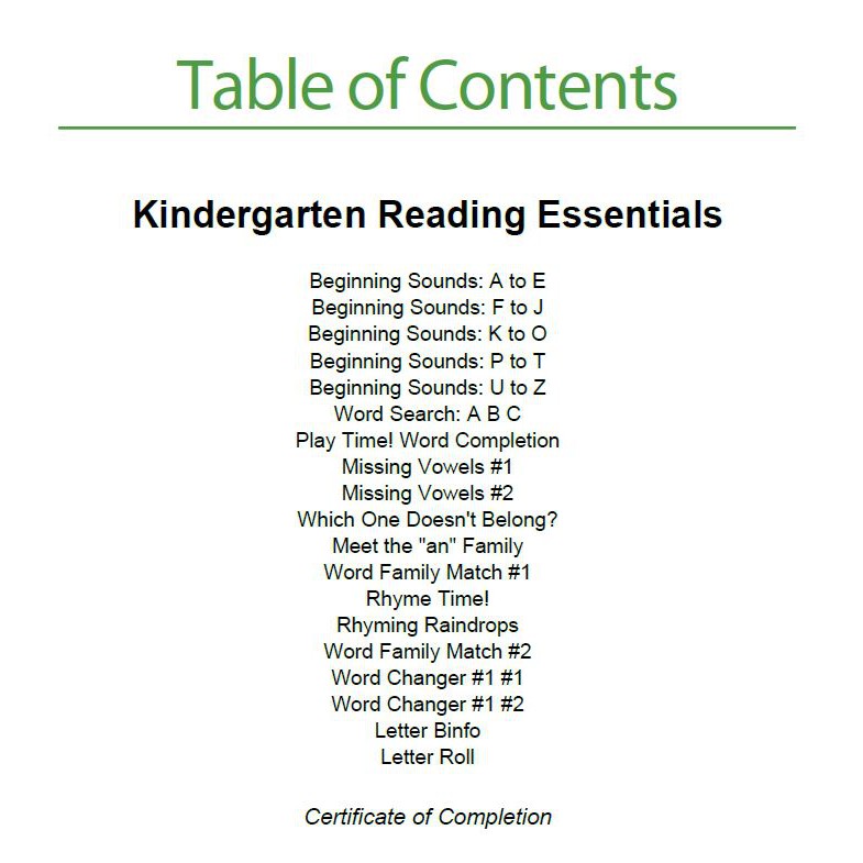 Kindergarten Activity Workbook / Worksheets: Reading Skills