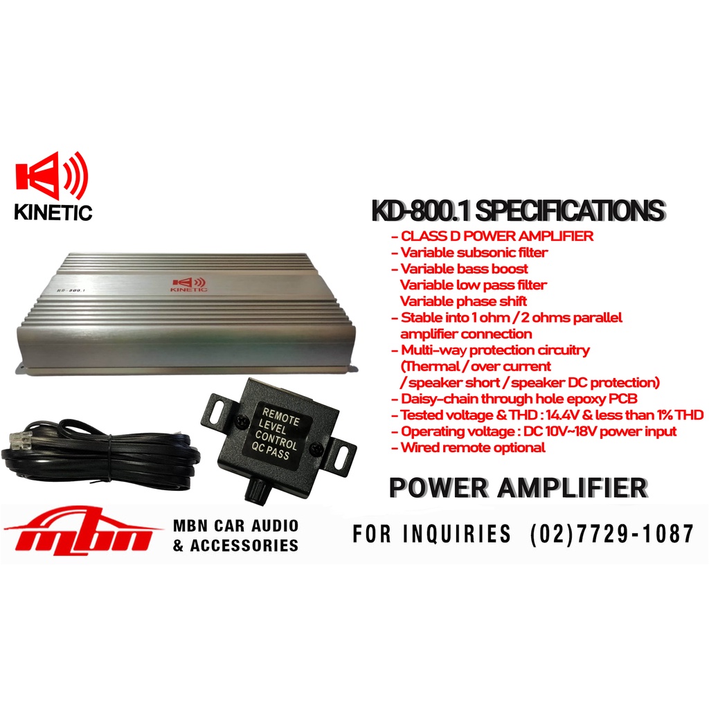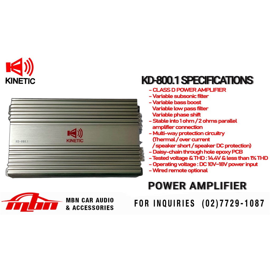 Kinetic KD-800.1 Mono Amplifier 800RMS Output Power / 1600watts Max Power, Car Audio System Aplifier