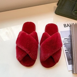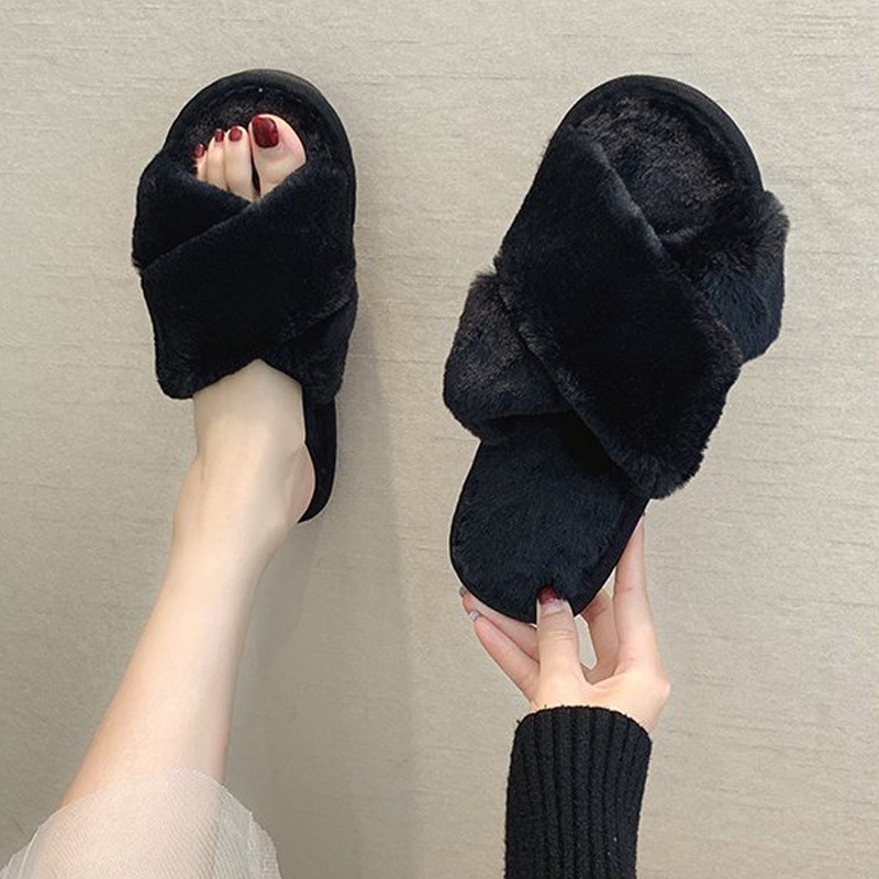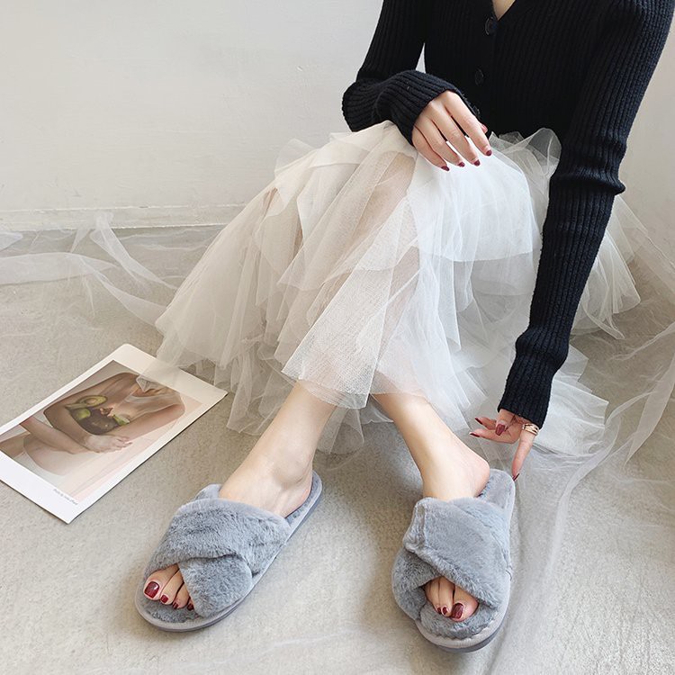 Korea fashion Rabbit fur Winter Plush slippers indoor Non-slip house slippers for women rabbit cross