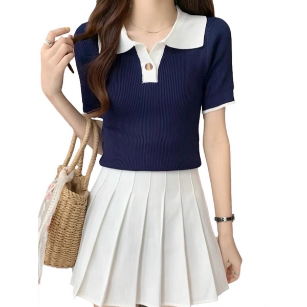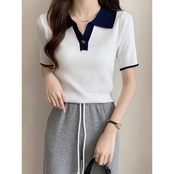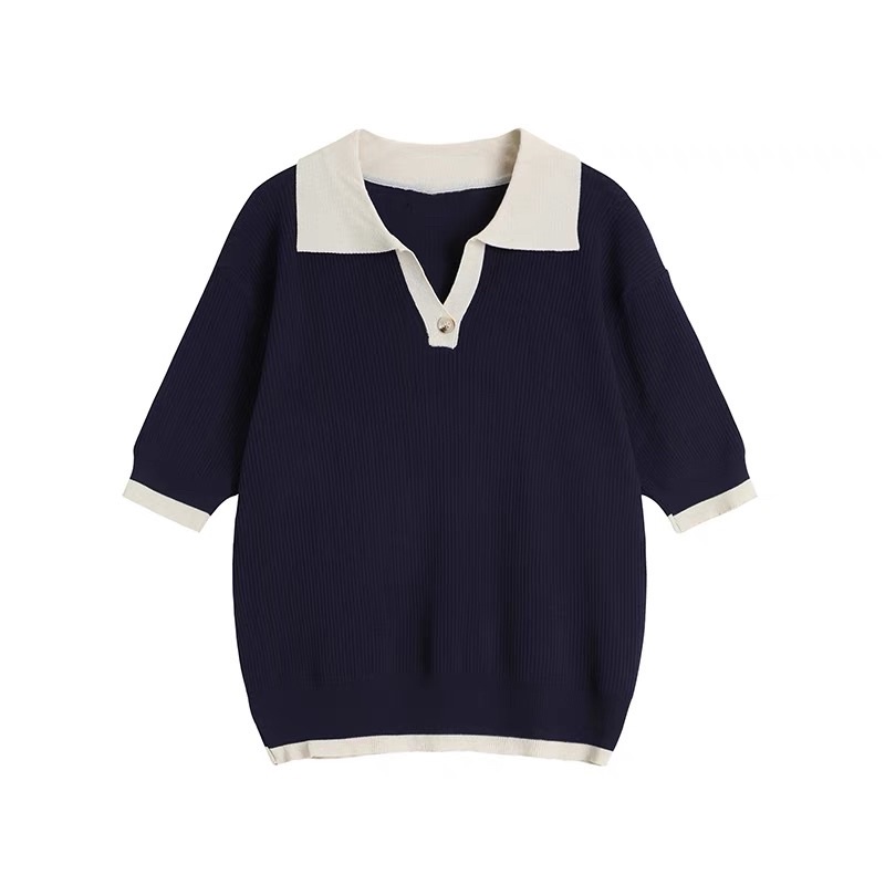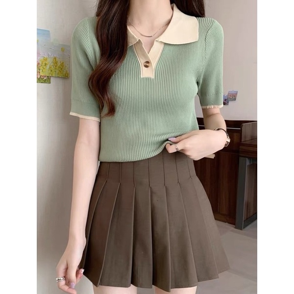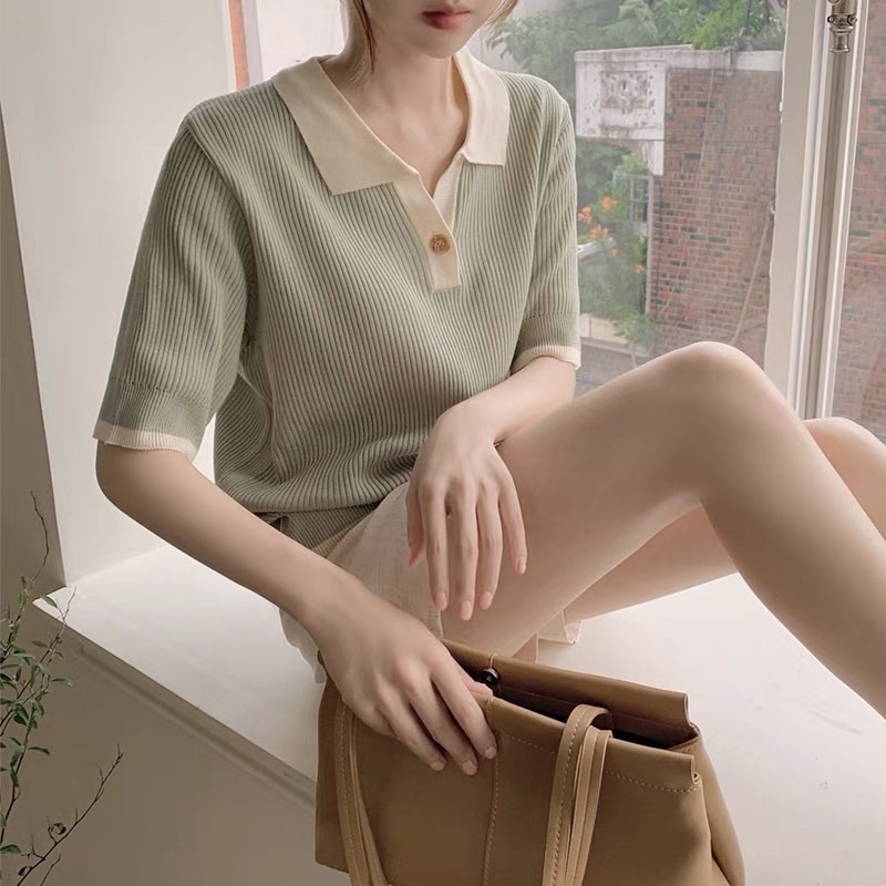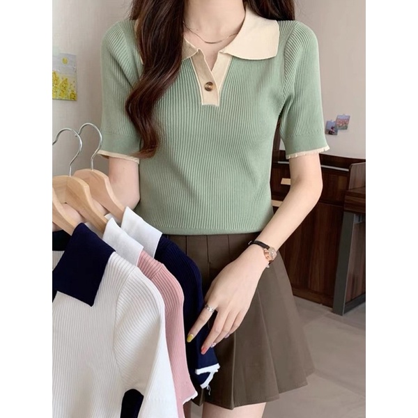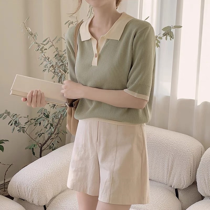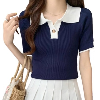 Korean Fashion Knitted Collar V neck button Blouse Top Shortsleeves