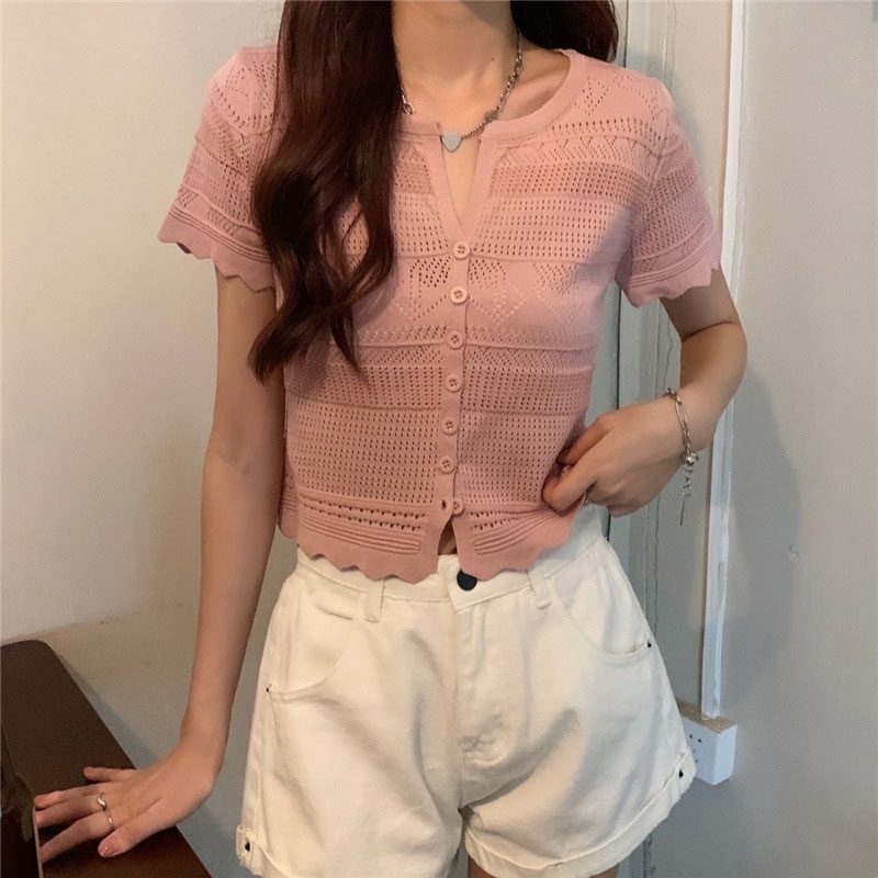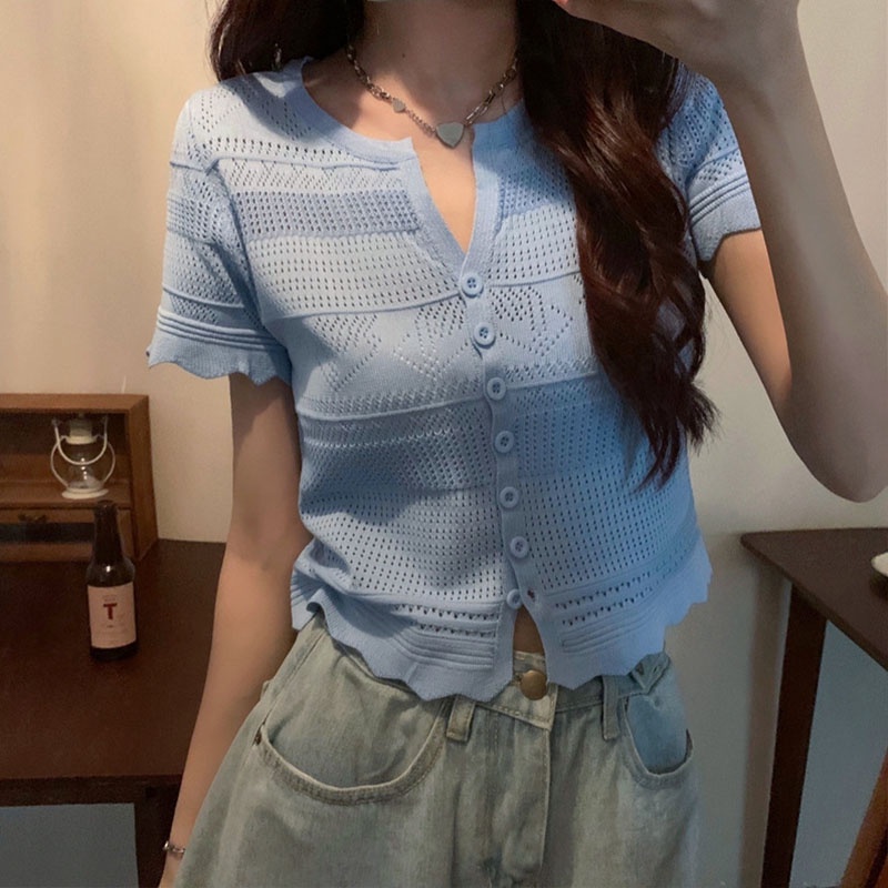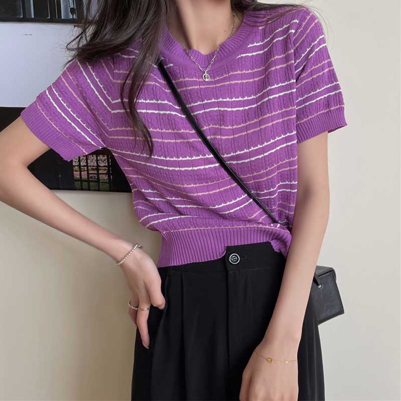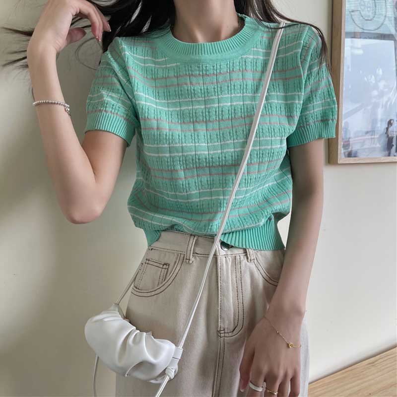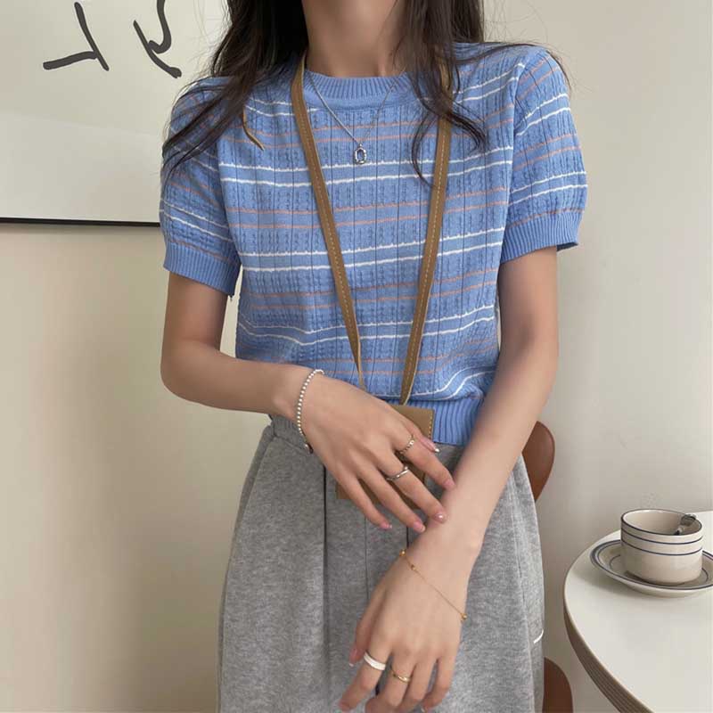 Korean Short-Sleeved Pure Cotton T-Shirt Women'S Oversized Round Neck Striped Knit Top Multicolor