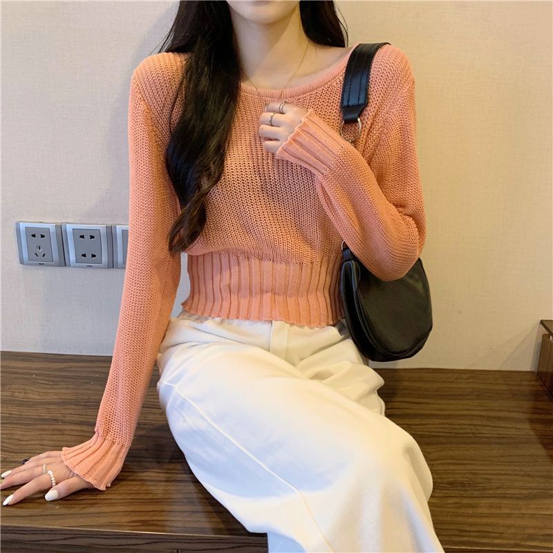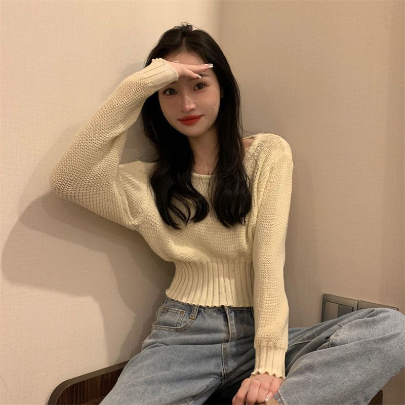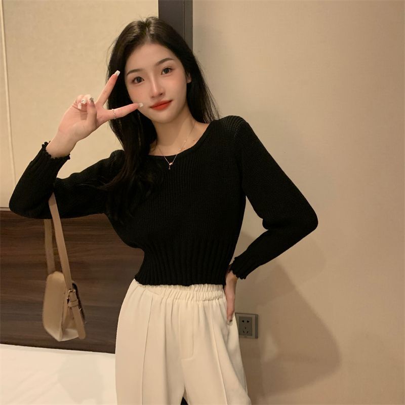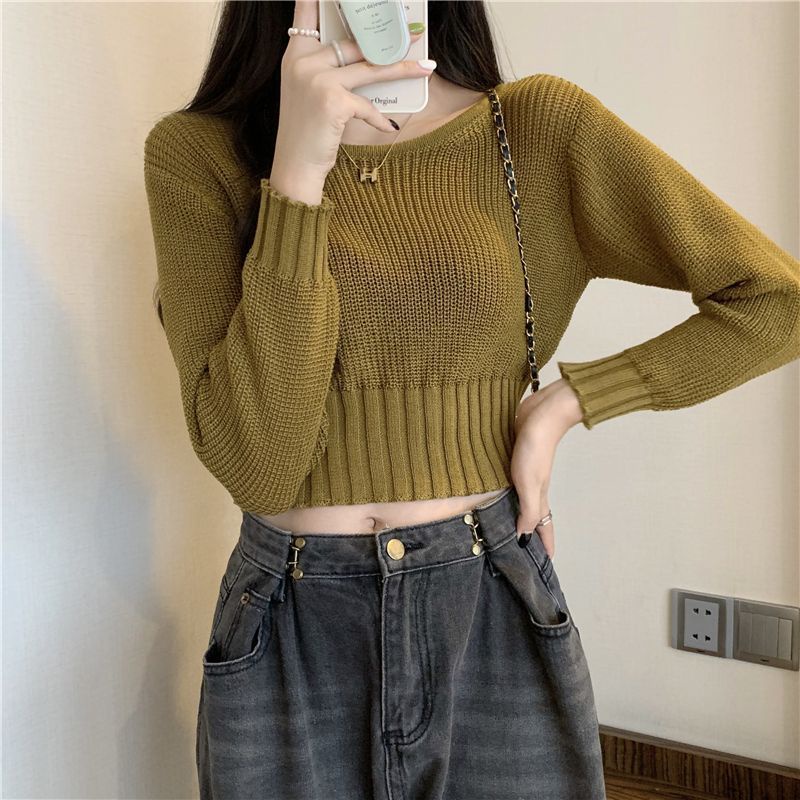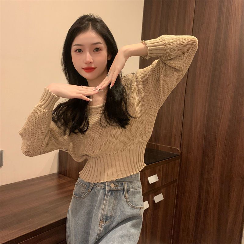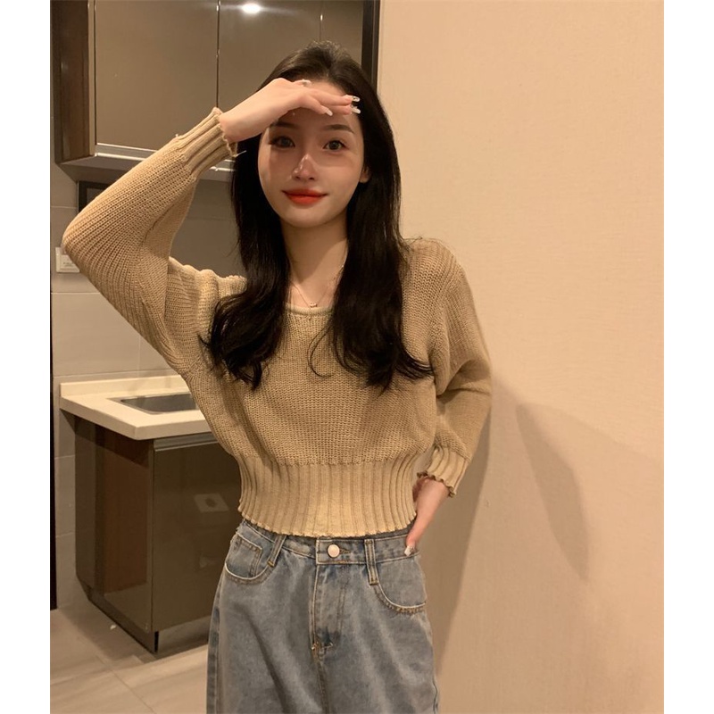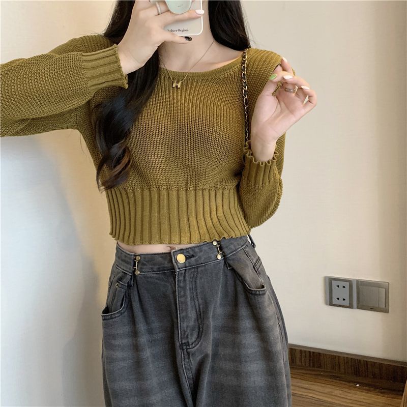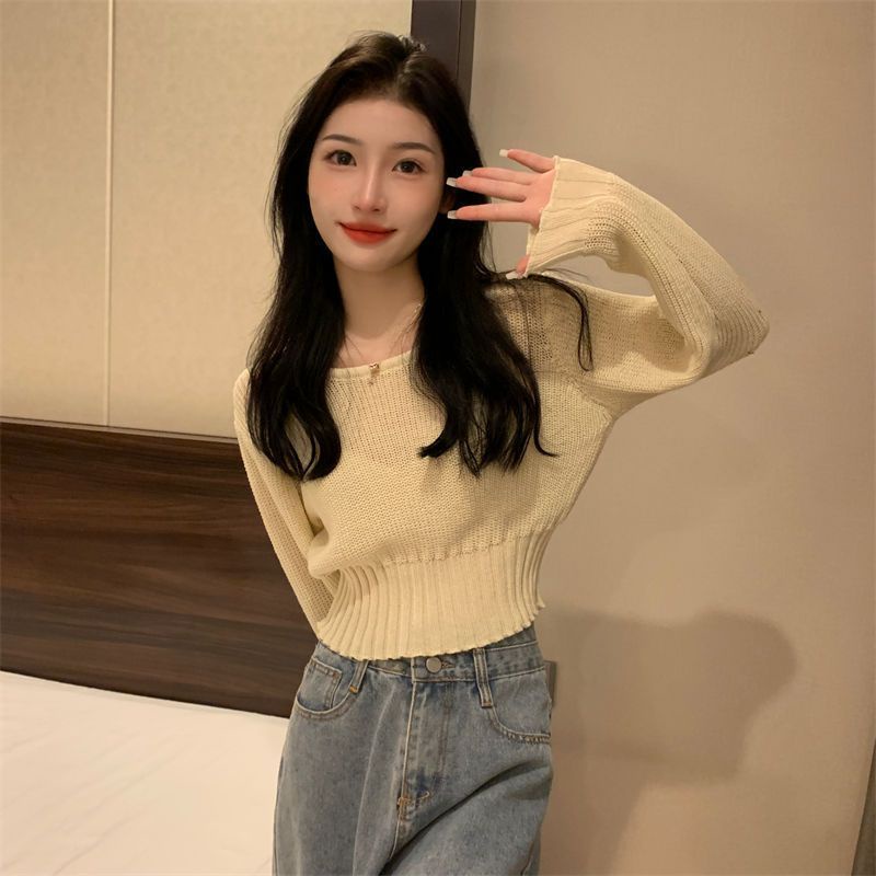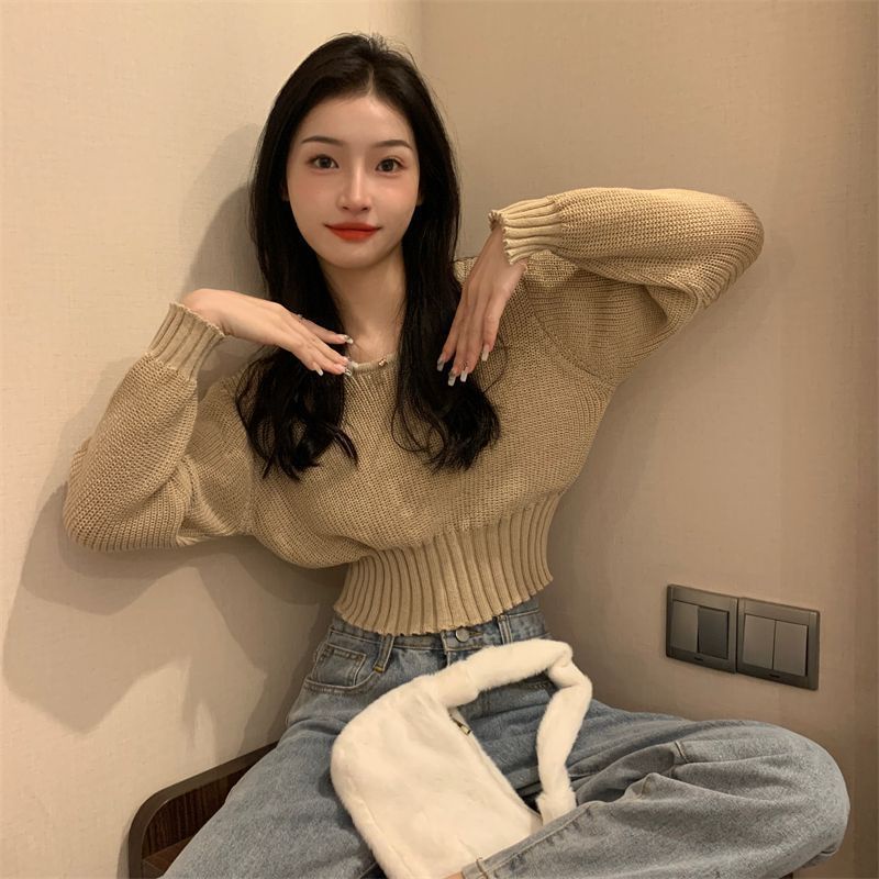 Korean Solid Color Round Neck Long Sleeved Sweater Women's Gentle Retro Knitted Crop Top