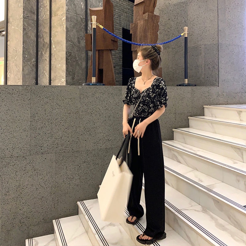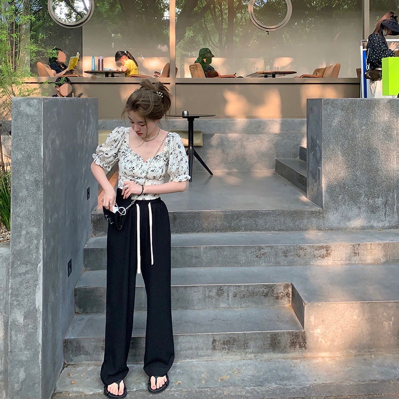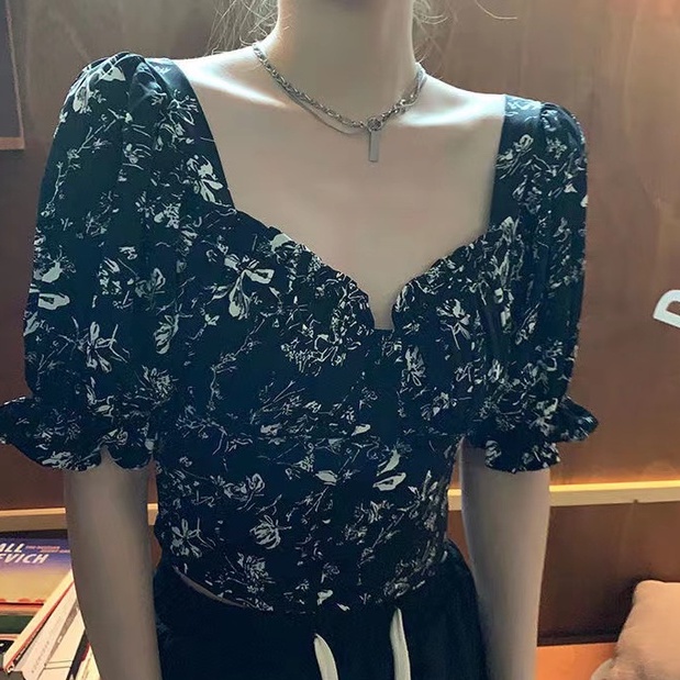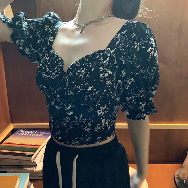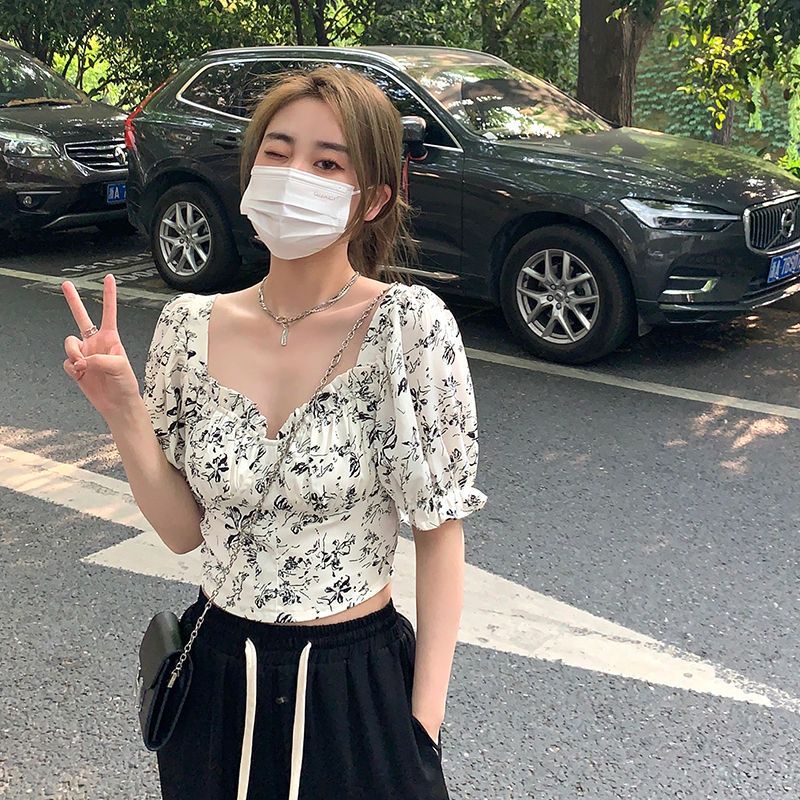 Korean-style women's crop top with bubble sleeves and floral V-neck short sleeves