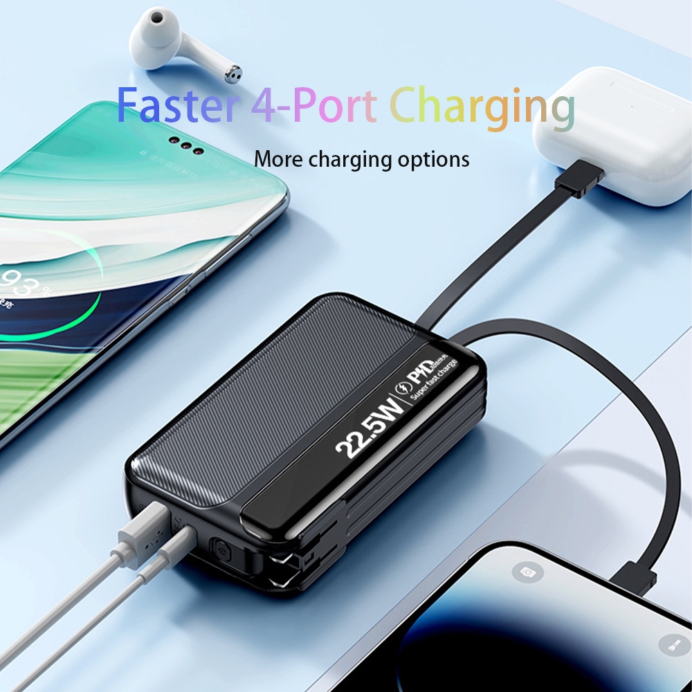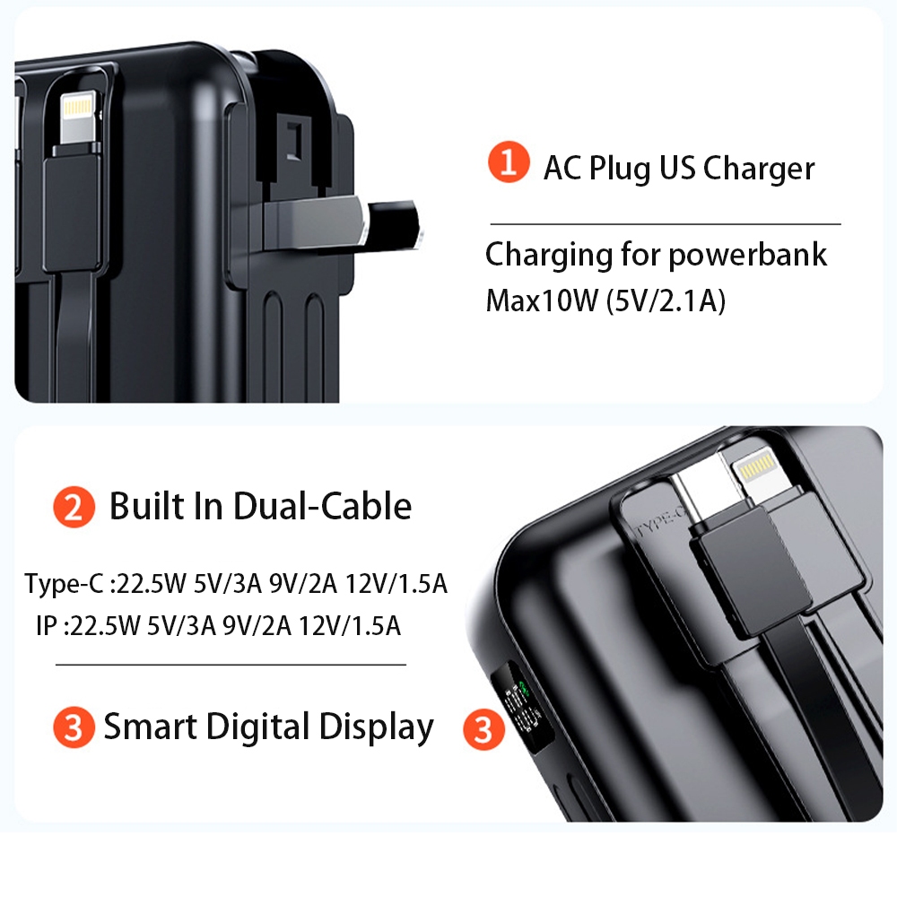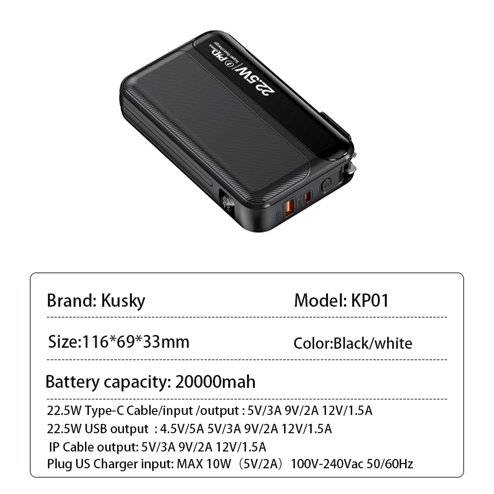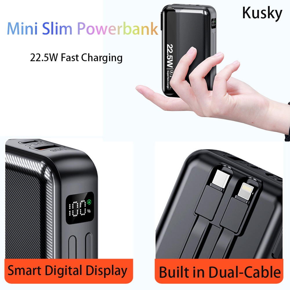 Kusky 22.5W Fast Charging 20000mah Power Bank Built-In Dual Cable Plug US Charger Mini Slim powerbank