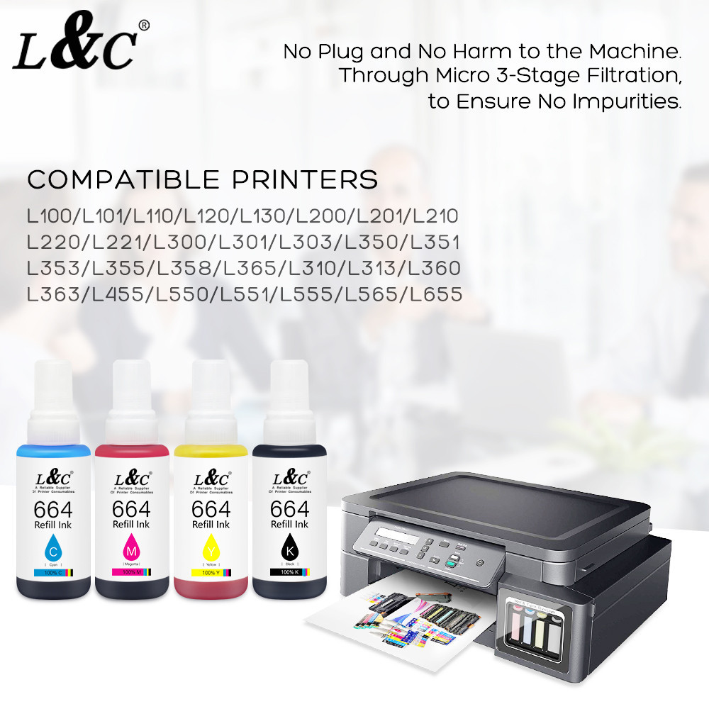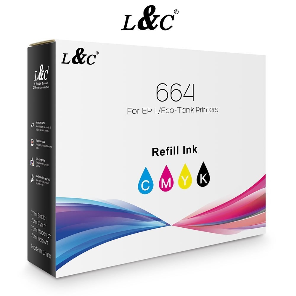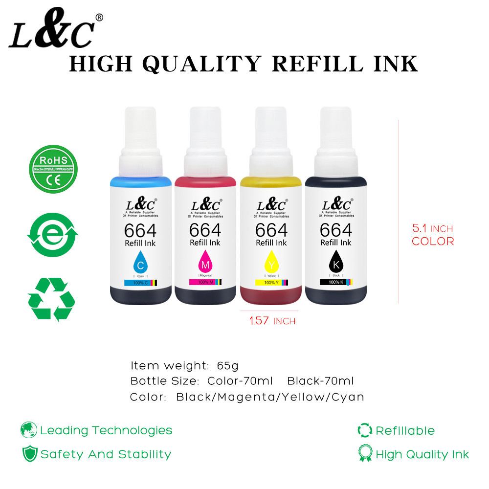 L&C 664 Ink Refill ink Dye Ink For Printer L120 L130 L200 L201 L210 L455 L550 L565 L655 70ML