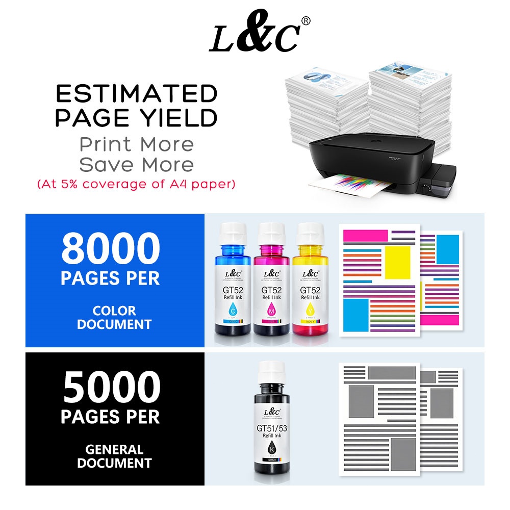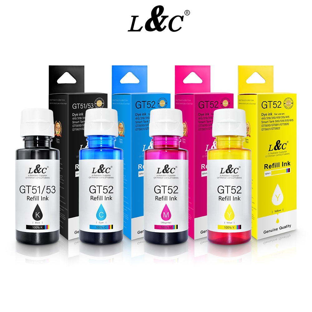 L&C Refill Hp Ink GT51 GT52 GT53 Dye Ink For HP Deskjet Printer GT5810 GT5820 GT5811