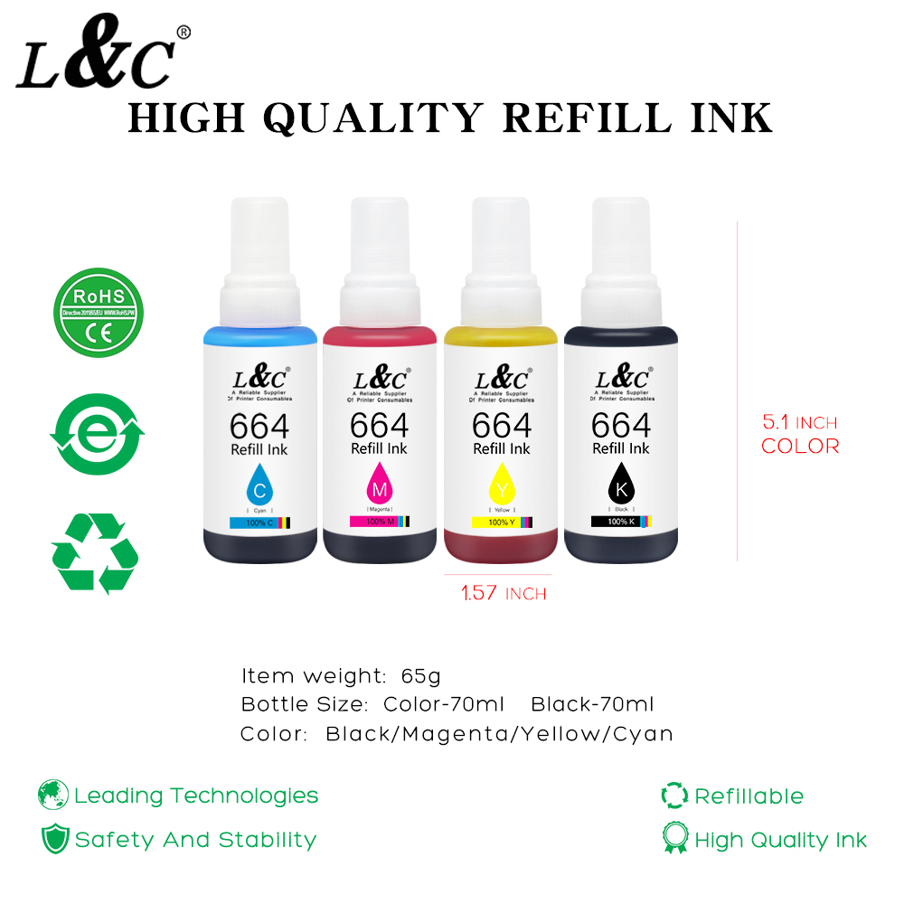 L&C Refill Ink 664 Ink Dye ink For Printer L120 L130 L201 L210 L220 ET2500 2550 70ml No Box