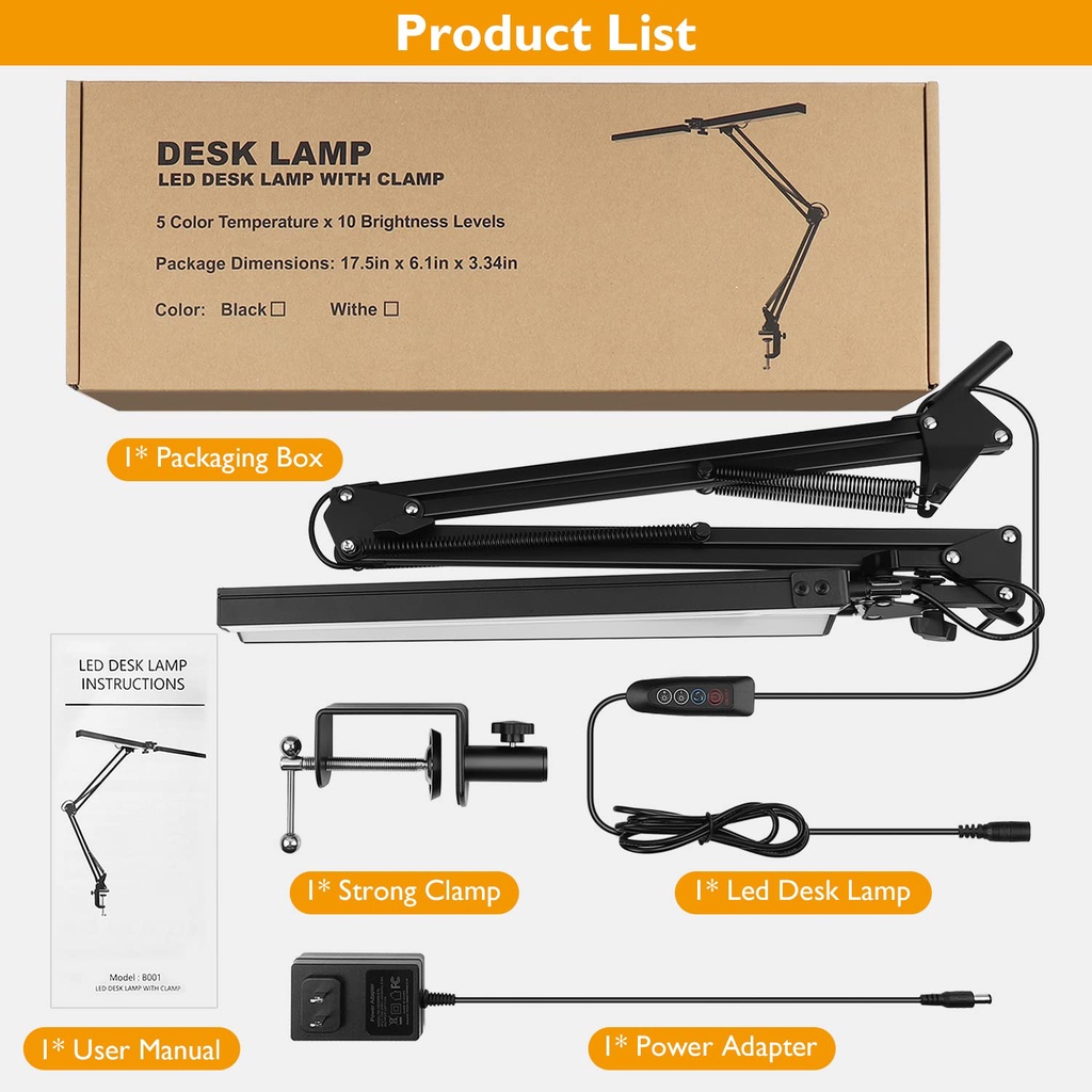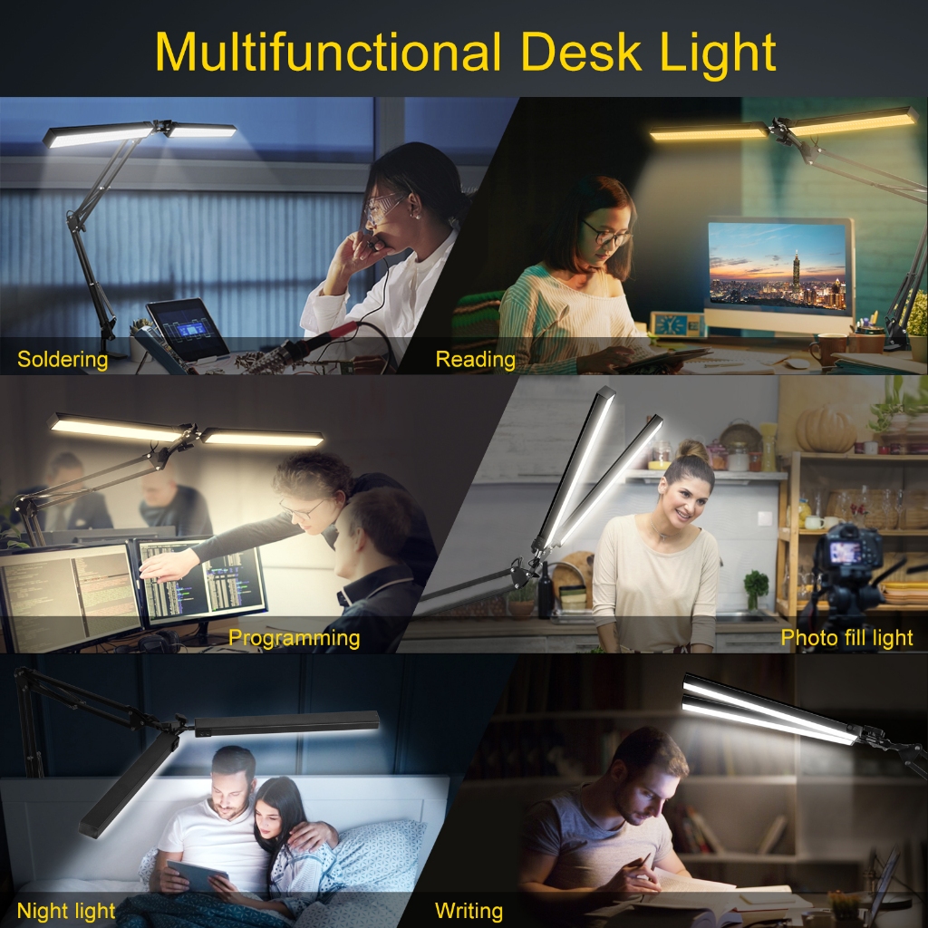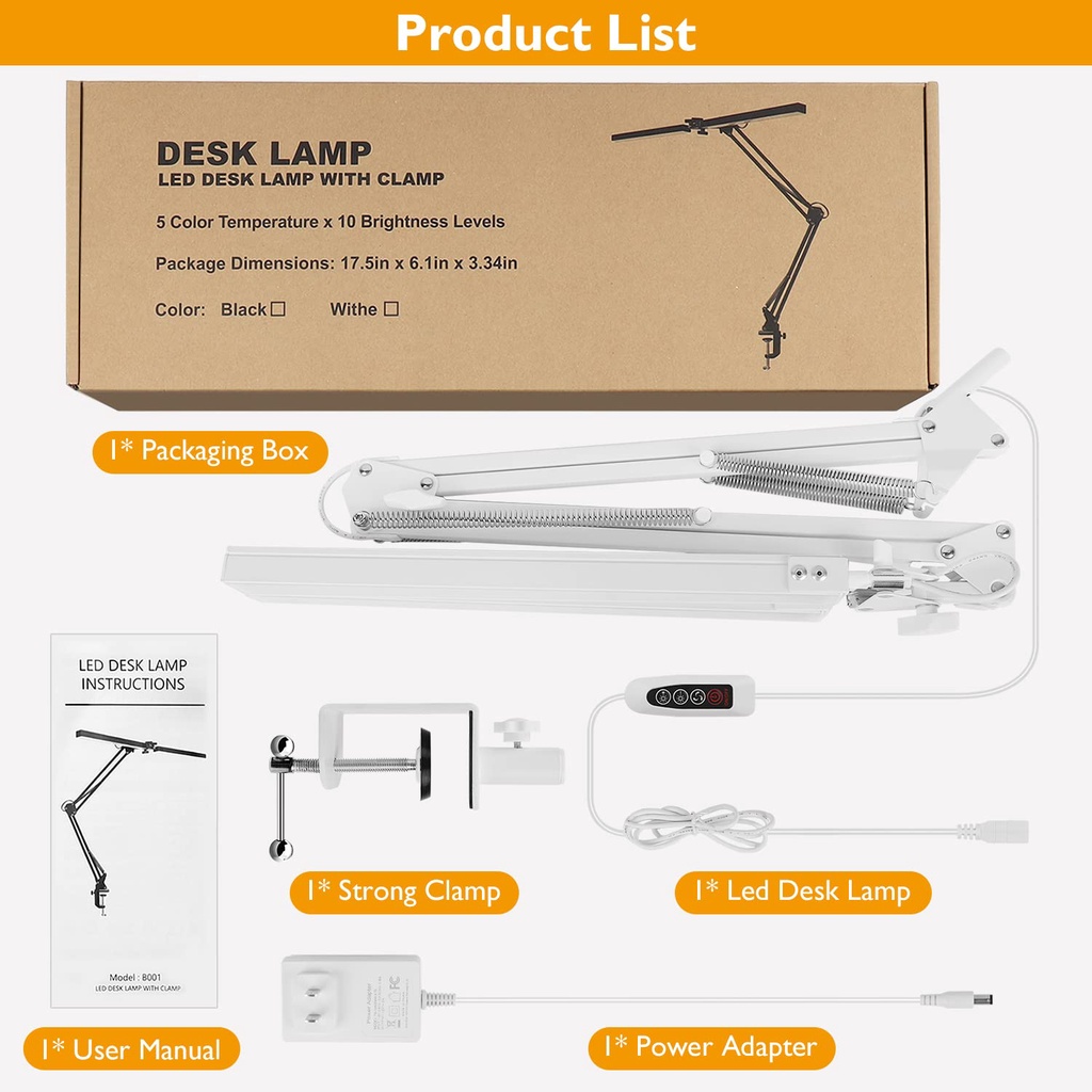 LACOCO LED Folding Metal Desk Lamp Clip On Light Clamp Long Arm Dimming Table Lamp Adjustable